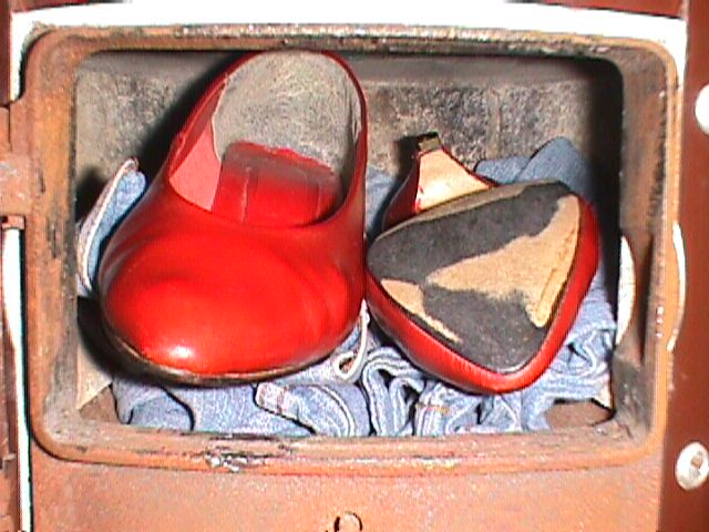 Mit großer Freude griff Katrin nach dem ersten Schuh, und öffnete die Feuertür. Wie sie es von ihrer Mutter gelernt hatte, fasste sie den Pumps an der Ferse mit der Sole nach oben. Mit seiner Schuhspitze zerteilte Katrin die Glut des Sneakers und schob dann den armen Schuh in den Herd. Wie hypnotisiert schaute sie ins Feuerloch, während das schöne rote Leder immer heftiger loderte. Sie bemerkte nicht einmal, dass sie mit Ihren braunen sexy Wildlederoverknees den anderen Pumps vor dem Herd ganz schön zertreten hatte. Die Schuhspitze des Pumps im Ofen rollte sich unter den Schuh und der Absatz zeigte direkt auf unsere Katrin. Jetzt amüsierte sich ihre Freundin nicht nur über die Vernichtung Ihrer Peiniger, sondern auch über Katrins Treiben am Herd. Diese entgegnete aber nur belustigt, dass Sie Ihrer Freundin doch nur zeigen wolle, dass die Pumps auch wirklich vom Feuer aufgefressen werden. Anschließend hob sie den breitgetretenen Schuh vom Fußboden auf und legte Ihn diesmal mit der Sole nach unten auf den immer noch heftig lodernden ersten Pumps im Herd. So konnte Katrin besser sehen, wie sich die Schuhspitze nach oben rollt. Würde nicht der Teekessel auf der Herdplatte stehen, hätte die Spitze bestimmt die Platte angehoben. Für beide Pumps war eben wenig Platz in der engen Brennkammer. Als Katrin die Herdtür schloss, fing das Ofenrohr an zu glühen. Nachdem sie auch noch einen Sneaker aus der Brennstoffkiste bei geschossener Herdtür verheizt hatte, konnte Katrin endlich den Tee aufbrühen.