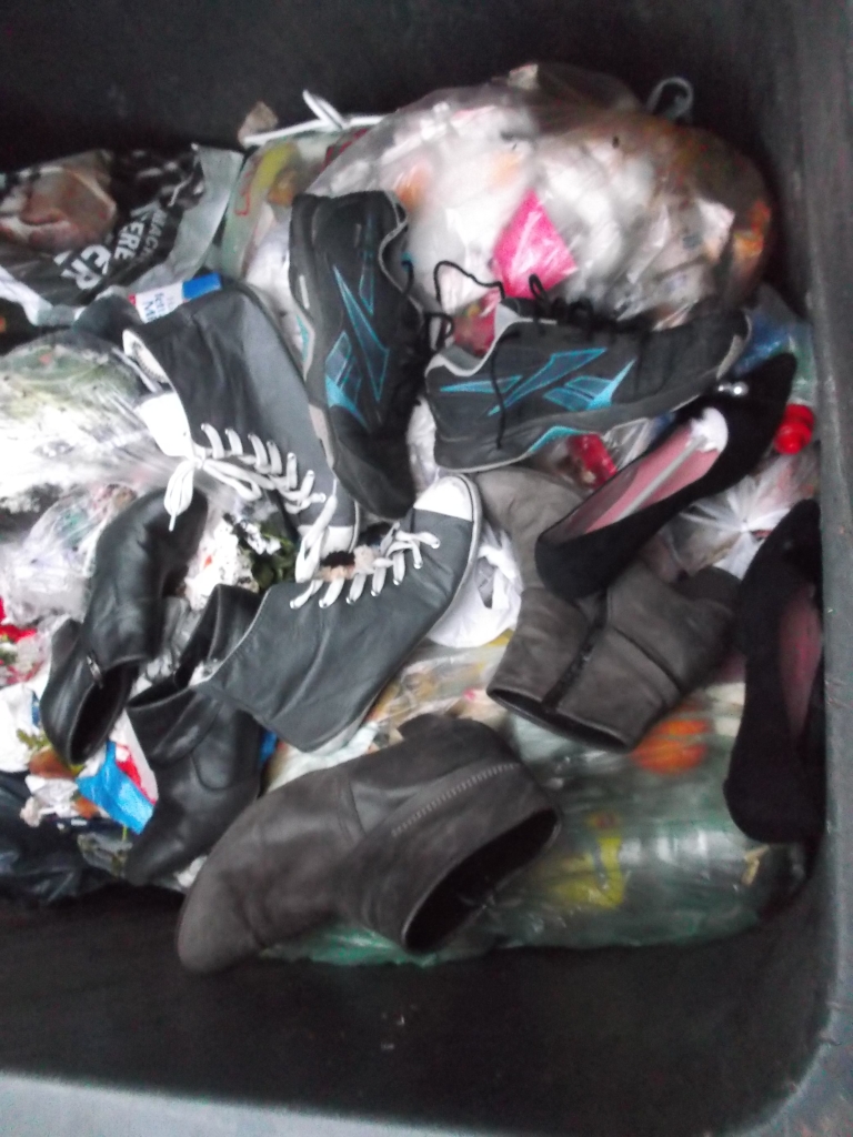 ² Das umfaßt die Teile aus "Tonnen", Abfallbehältern, Sperrmüll und den mir übergebenen "Entsorgungsaufträgen", nicht aber die Schuhe, die ich direkt zum Weitertragen erhalten oder getauscht habe und vom Flohmarkt Gekaufte.