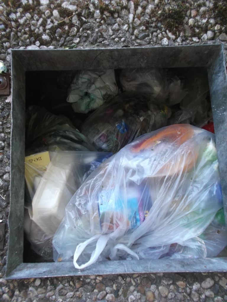 Immer wieder wurde der Deckel der Müllbox geöffnet und man hörte das dumpfe Plumpsen und Rascheln der Mülltüten.