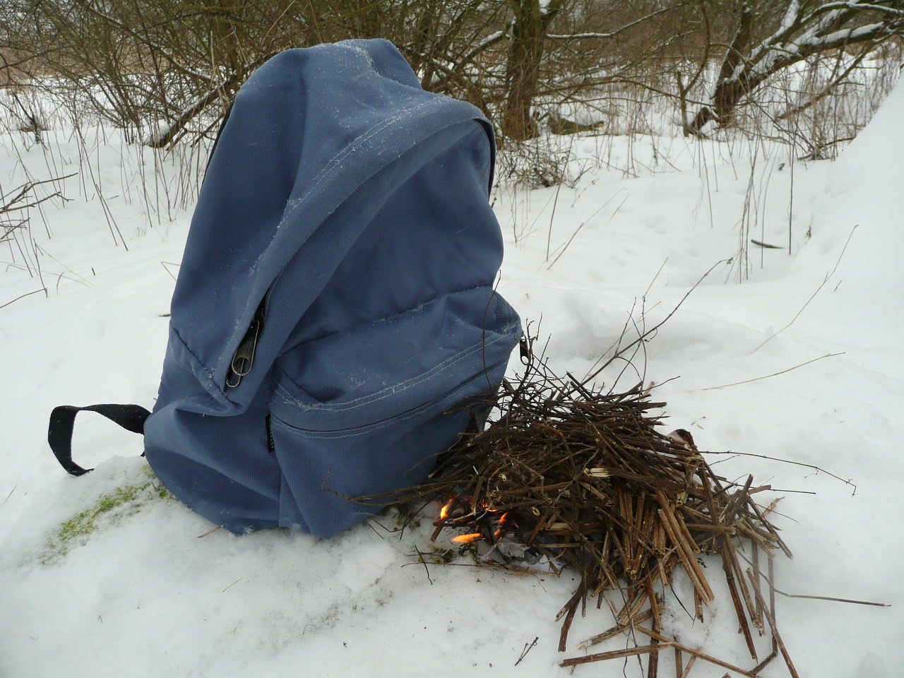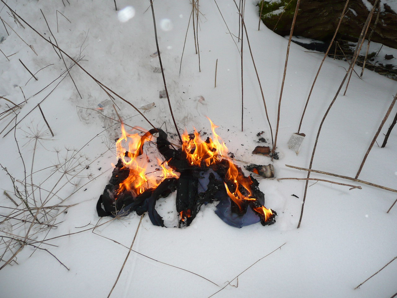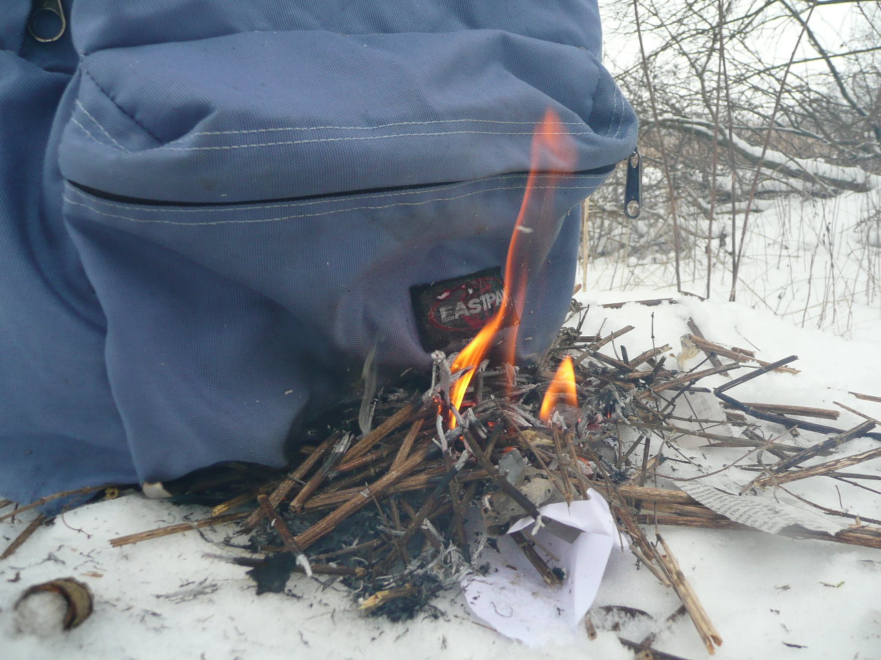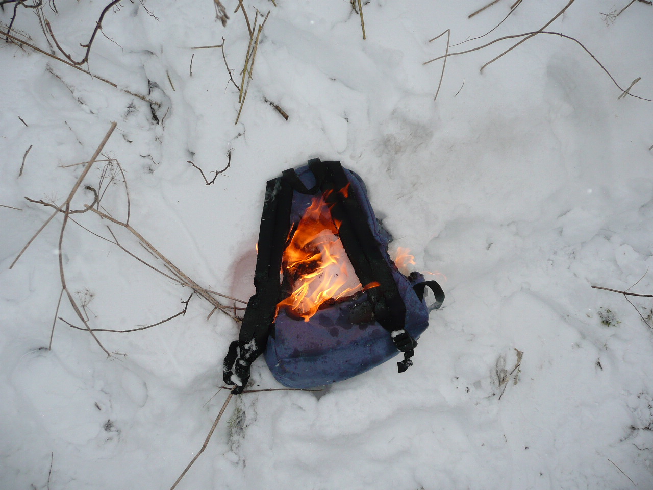 Aber wenn du die brennenden Reste rechtzeitig zusammen geschoben hast, dann ist sicherlich fast alles in Rauch aufgegangen. Geradezu witzig sieht das vorletzte Bild aus. Man könnte meinen, du hast versucht, glühende Kohlen mit dem Rucksack zu transportieren.