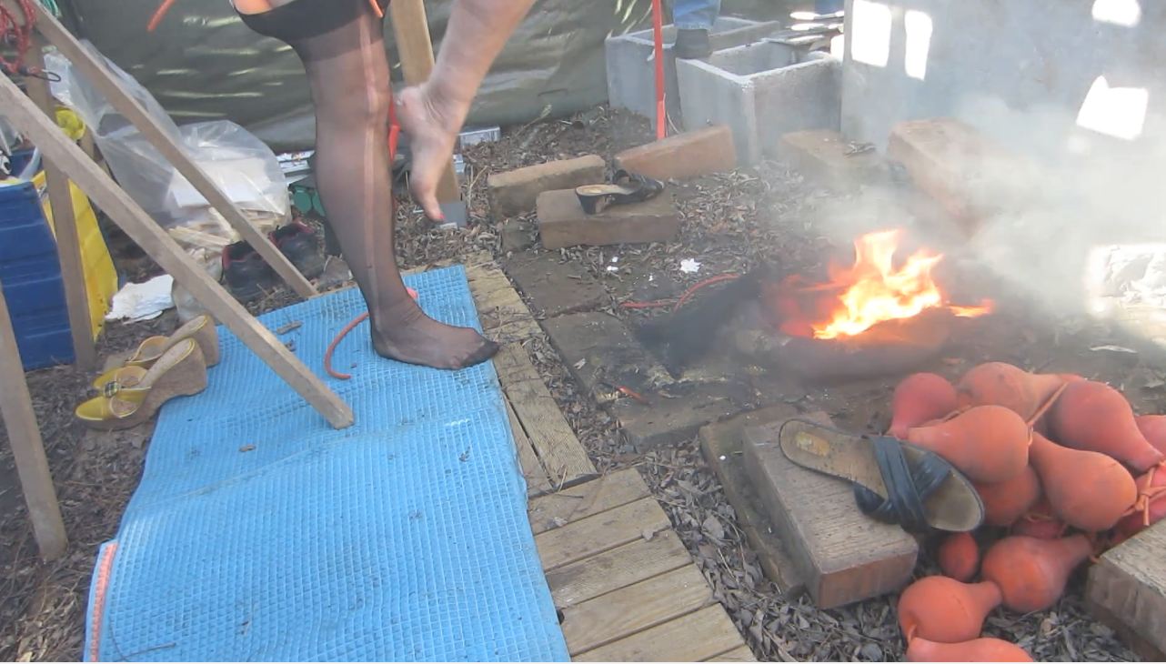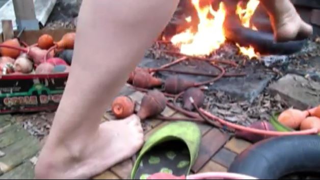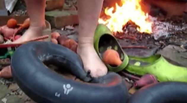 Gummi verbrennen hat angefangen, als ein Gummisauger verbrannt ist, dann folgten Gummiauoreifen, Gummigebläse (wie auf meinen Fotos/Videos) zuerst traten Frauen mit nylonbestrumpften Füßen auf diesen Gummigebläse, dann verheizten sie diese in einem Ofen oder in einem Feuer im Freien