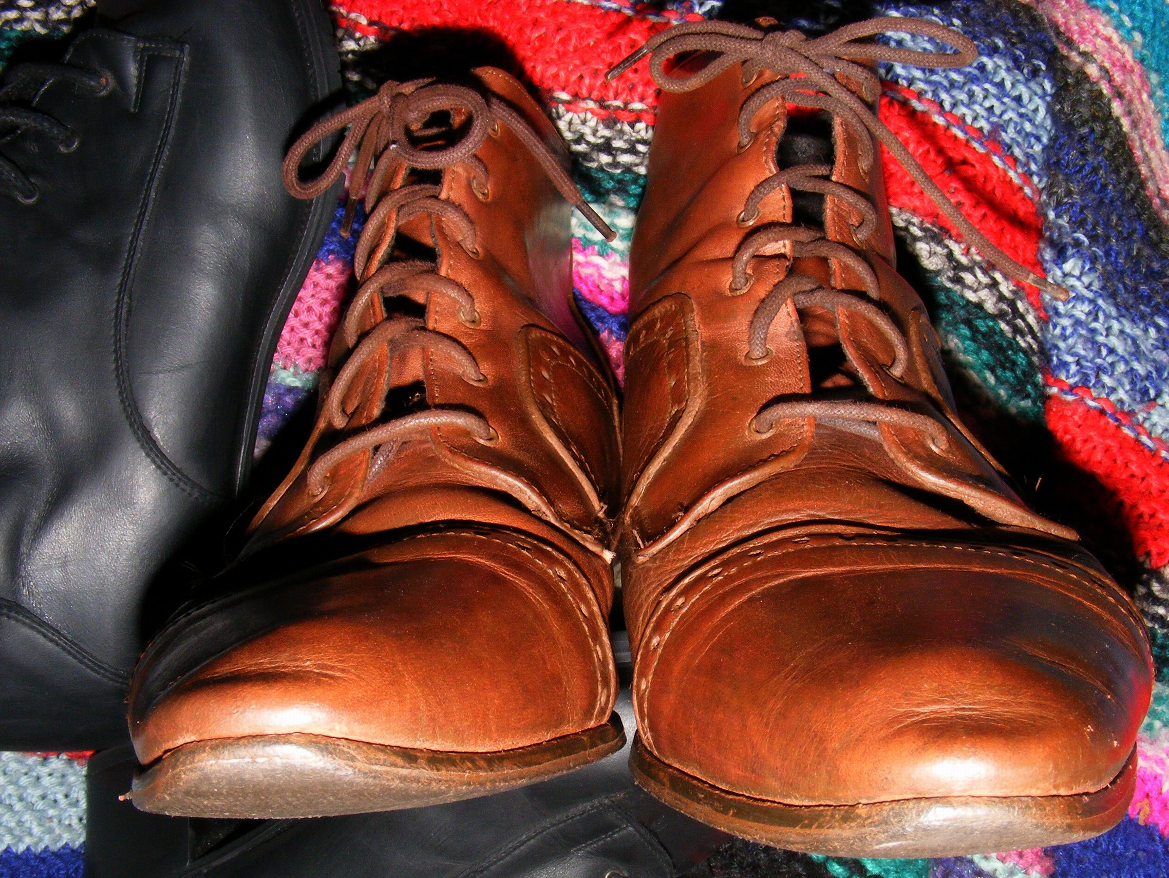Da will ich doch auch mal den anderen Mädels hier einen Gefallen tun und mal meine fast endfertigen braunen Schühchen Päsentieren. Auch diese Sperrmüllis lagen nach ihrem Auffinden 1998 gleich vor dem Badeofen, beinahe hoffnungslos erschien mir ihr Zustand, total verkratzt und entfärbt, die Absätze schrecklich hin, die Schnürsenkel nur noch Fasern - bis ich in der Hitze und des Flammenscheins ihrer bereits brennenden "Schwesternpaare" aus der gleichen Quelle die übliche "letzte Anprobe" vor dem Verfeuern machte und sie daraufhin erst einmal beiseite stellte. Mit unbeschreiblichen Aufwand restauriert, trug ich sie als anti-modischen Protest in der "Plateauschuhzeit" 1998/99!