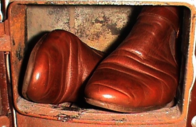 Was empfindet der/die Gummistiefelfeti beim Anblick seiner/ihrer falten- und charakterlosen Lieblinge, die getragen genauso aussehen, wie ungetragen? Da gibt´s nur sauber oder dreckig, ganz oder kaputt. Wo ist die künstlerische Einzigartigkeit, der bei Lederschuhen verewigten Fuß- und Zehenform des Trägers/der Trägerin?