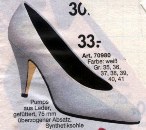 Auch wenn´s nicht so dein Fall ist, ich trage im Sommer und auf der Arbeit sehr oft Pumps. Na, halt die Klassischen aus Leder, mit schlanken 4-9 cm Absätzen. Die lagen bis vor einigen Jahren massenweise in Sperrmüll. Alle Passenden, besonders die schönen leichten 1990er Reno-Pumps, habe ich erst einmal größtenteils in Kartons verpackt und dann wieder nach und nach "Abgetragen". Auf Grund der vorhandenen Mengen hatte ich sie nicht wieder Aufgearbeitet, sie kamen dann in eine extra-Kiste, die bei Bedarf von meiner BF zum Verfeuern abgeholt wurde.