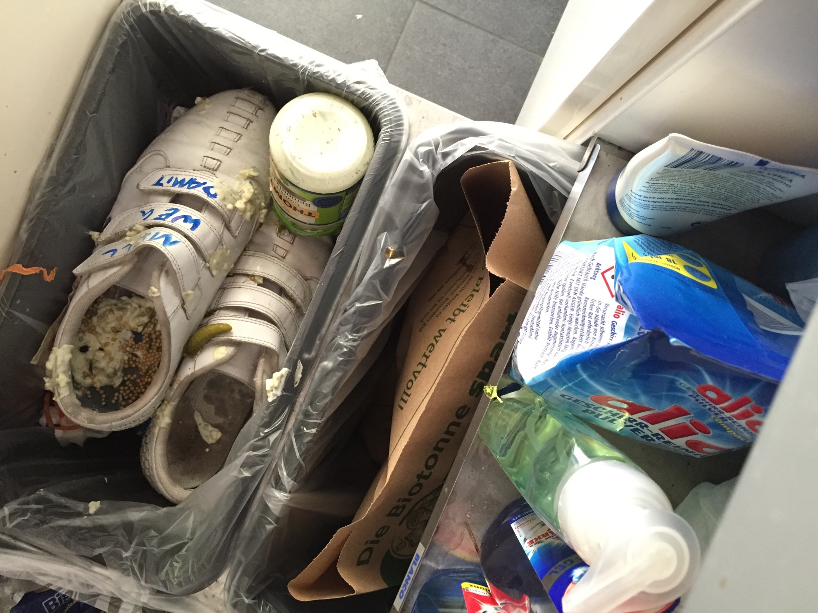 ...ab in den Küchenmüll mit Janines Lacsote Sneakers. WEr hat die eigentlich mit Edding beschmiert? Na egal, ab weg damit.