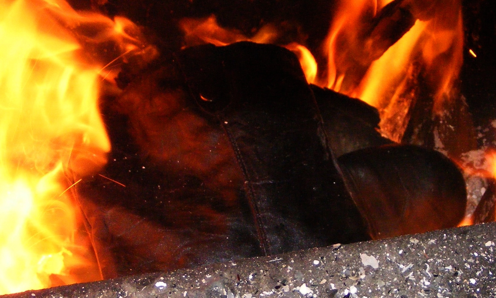 Der zweite Stiefel kommt direkt vor dem Ofen zu Liegen, Glut- und Ascheperlen seines brennenden "Bruders" fallen aus der Luftöffnung auf seinen faltigen Schaft. Daneben steht auch noch der zweite wundervolle braune Schnürschuh! :P