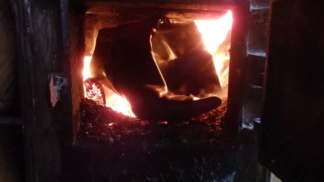 Ein Genuß für alle Sinne: Von mir einige Tage als Schneeräum- und Heizkeller-Arbeitsschuhe getragene Synthetikstiefel vom Sperrmüll dienen ím Winter nun selbst der Beheizung unseres Hauses. Üblicherweise kommen bei mir alle Schuhe in den bereits "heißen" Ofen und müssen nicht lange Leiden. Der Anblick brennender Stiefel erregt mein "Bärchen" in unbeschreiblicher Weise ...
