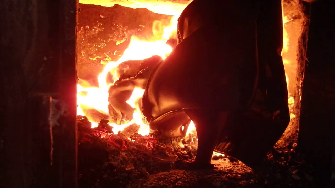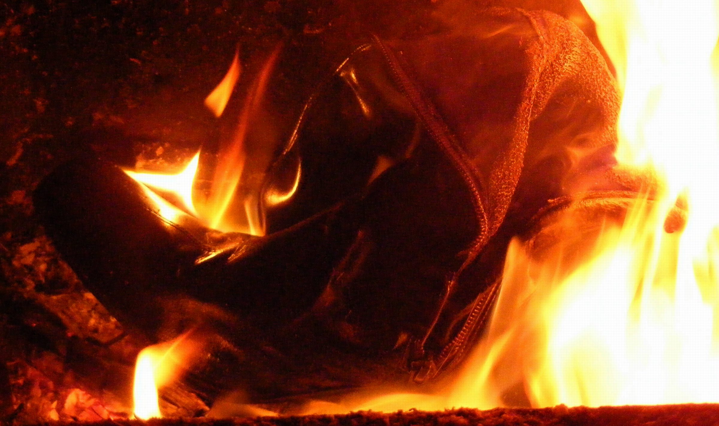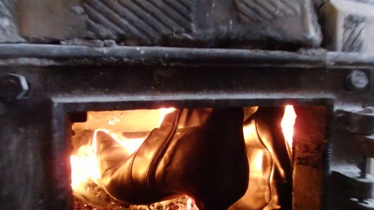Ein Genuß für alle Sinne: Von mir einige Tage als Schneeräum- und Heizkeller-Arbeitsschuhe getragene Synthetikstiefel vom Sperrmüll dienen ím Winter nun selbst der Beheizung unseres Hauses. Üblicherweise kommen bei mir alle Schuhe in den bereits "heißen" Ofen und müssen nicht lange Leiden. Der Anblick brennender Stiefel erregt mein "Bärchen" in unbeschreiblicher Weise ...