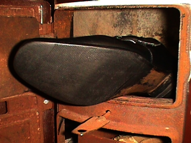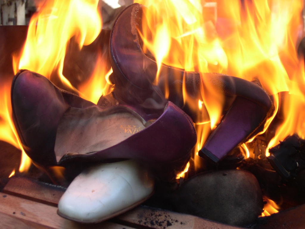 Wie sie sich mehrfach Verwinden, Krümmen bis die Spitze die Innensohle erreicht und sich dabei oftmals fauchend die Sohlen lösen, sie sich danach meist nochmals wieder Strecken, spätestens dabei die Seitennaht aufreißt und die Hacken über den brennenden Absätzen zumeist nach Außen hin "abfallen", die Kunststoffabsätze schmelzend verbrennen und langsam die "Sicht" auf das glühende Federeisen freigeben, brennende Tropfen und schließlich die ersten Metallteile durch den Rost in den Aschekasten fallen - ja, das ist schon ein erregender Anblick ...