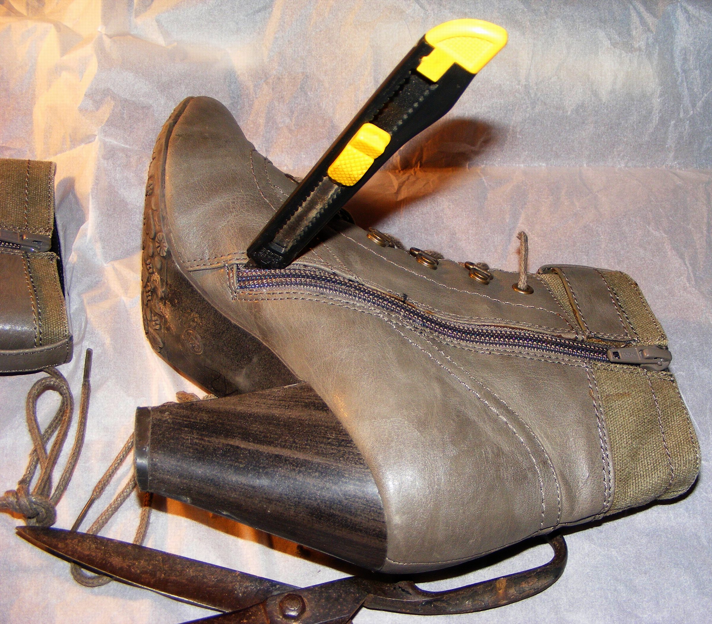 Doch diese Stiefeletten meiner wundervoll schönen Lieblingsblogueuse und Fotomodell (u.a. auch Fußmodell) sollten zwar ebenfalls verbrannt werden, aber ich durfte sie als "Ersatzteilspender" benutzen, weil ich diese Absätze für ein Paar wertvolle braune Vintage-Lederstiefel brauche.