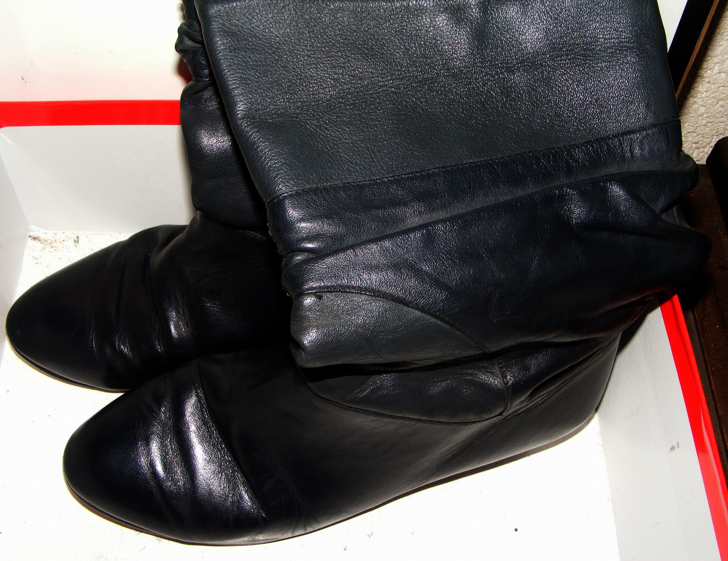 An diesem Tag wollte ich die erstmals gekaufte Erdal-Schuhkreme ausprobieren - dazu kam mir der hart getrocknete, schimmlige Stiefel gerade recht. Also testete ich die Kreme ausgiebig an ihm, ließ ihn einige Tage stehen. Ich beobachtete, daß die Kreme perfekt die Kratzer und Schimmelflecken verschwinden ließ und wie das Leder nach mehrmaliger Behandlung butterweich wurde. Ich kremte nun auch den zweiten Stiefel ein und machte gleichzeitig bei der ursprünglichen Größe 39 den Dehnungstest um eine Nummer, indem ich die Stiefel zu Hause trug. Nach einigen Tagen waren die Stiefelchen paßgerecht Eingetragen und ich führte sie "auf die Straße" aus; machte sogar mit ihnen meinen seinerzeitigen Freund "scharf". :P