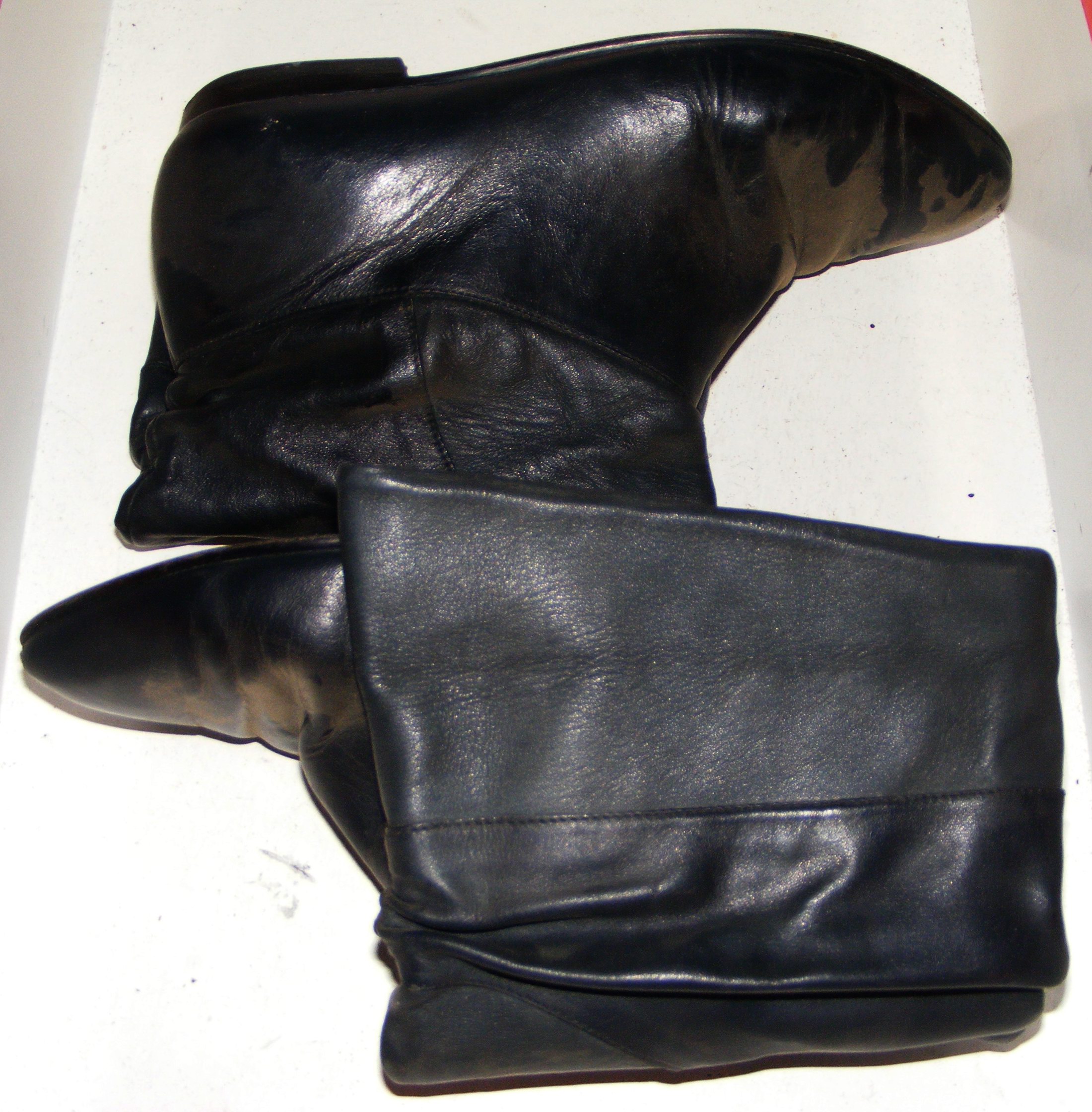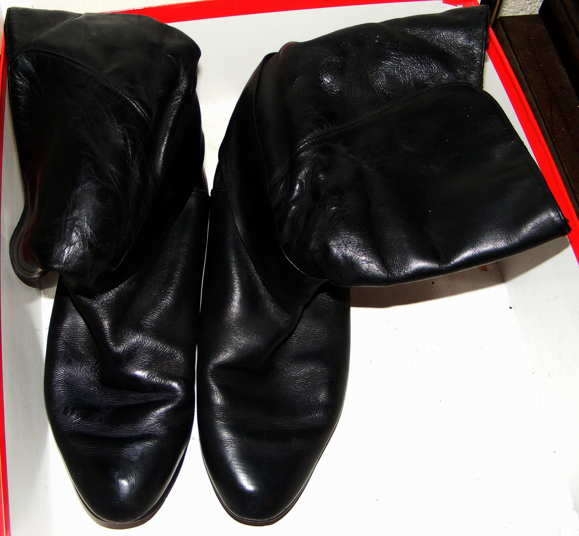 An diesem Tag wollte ich die erstmals gekaufte Erdal-Schuhkreme ausprobieren - dazu kam mir der hart getrocknete, schimmlige Stiefel gerade recht. Also testete ich die Kreme ausgiebig an ihm, ließ ihn einige Tage stehen. Ich beobachtete, daß die Kreme perfekt die Kratzer und Schimmelflecken verschwinden ließ und wie das Leder nach mehrmaliger Behandlung butterweich wurde. Ich kremte nun auch den zweiten Stiefel ein und machte gleichzeitig bei der ursprünglichen Größe 39 den Dehnungstest um eine Nummer, indem ich die Stiefel zu Hause trug. Nach einigen Tagen waren die Stiefelchen paßgerecht Eingetragen und ich führte sie "auf die Straße" aus; machte sogar mit ihnen meinen seinerzeitigen Freund "scharf". :P