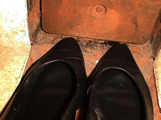 Aus Sicht des Feuers von Innen her, die Schuhspitzen hinter der geschlossenen Feuertür und am Besten brennen die Schuhe im Badeofen, wenn man die Tür bis auf einen Luftspalt anlehnt. Dieser Luftspalt sorgt dann für den unvergleichlich herrlichen Feuersturm-Sound, der dem Badeofen so eigen ist. :P