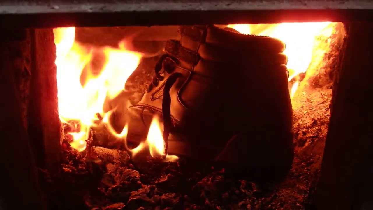 Dabei trug ich meine neu gekürten schwarzen Arbeitsstiefel und setzte mich vor den Herd. Ich stellte den ersten Schuh auf die vorbereitete Holzglut und ließ die Feuertür offen. Langsam begann er von der Spitze her zu Brennen. Dieses erregende Knistern des brennenden Lackleders und der herrliche Ledergeruch erinnerten mich an meine Kindheit, als meine Mutter meine und ihre Lackschuhe im Küchenherd verbrannte. Ich starrte in die Flammen, die von der sich nach oben biegenden Spitze an der Spange hocharbeiteten. Gerade als die Schnalle, vom Feuer gelöst, auf den Rost fiel, bewegte sich die Sohle fauchend von der Spitze, erzeugte eine wahnsinnige Hitze. So begann auch der Absatz in voller Ausdehnung zu Brennen. Die vordere Hälfte des Schuhes, einschließlich der Spangenbänder, war bereits fast völlig verschwunden, nur der Absatz mit der verstärkten Hacke stütze sich auf dem freigelegten Federeisen ab, bis auch dieser Teil umkippte und auf dem Rost verglühte. Es wurde Zeit für den zweiten Schuh. Ich faßte ihn an der Hacke und mit der Spitze ordnete ich das Glutbett für seine Einäscherung. Ich stellte ihn sogleich ebenfalls in die vorbereitete Glutmulde und beobachtete noch ein Wenig , bis wieder die Spitze völlig brannte. Doch diesmal wollte ich in den Genuß der typischen Brenngeräusche kommen und ich schloß die Feuertür bis auf einen kleinen Spalt. Im Gegensatz zum Ersten brannte der zweite Schuh wie wahnsinnig, ein Feuersturm brach los, der das Knistern des Lackleders weit übertönte. Die Herdplatte begann zu Glühen und bereits nach etwa zwei Minuten war wieder Ruhe im Herd.