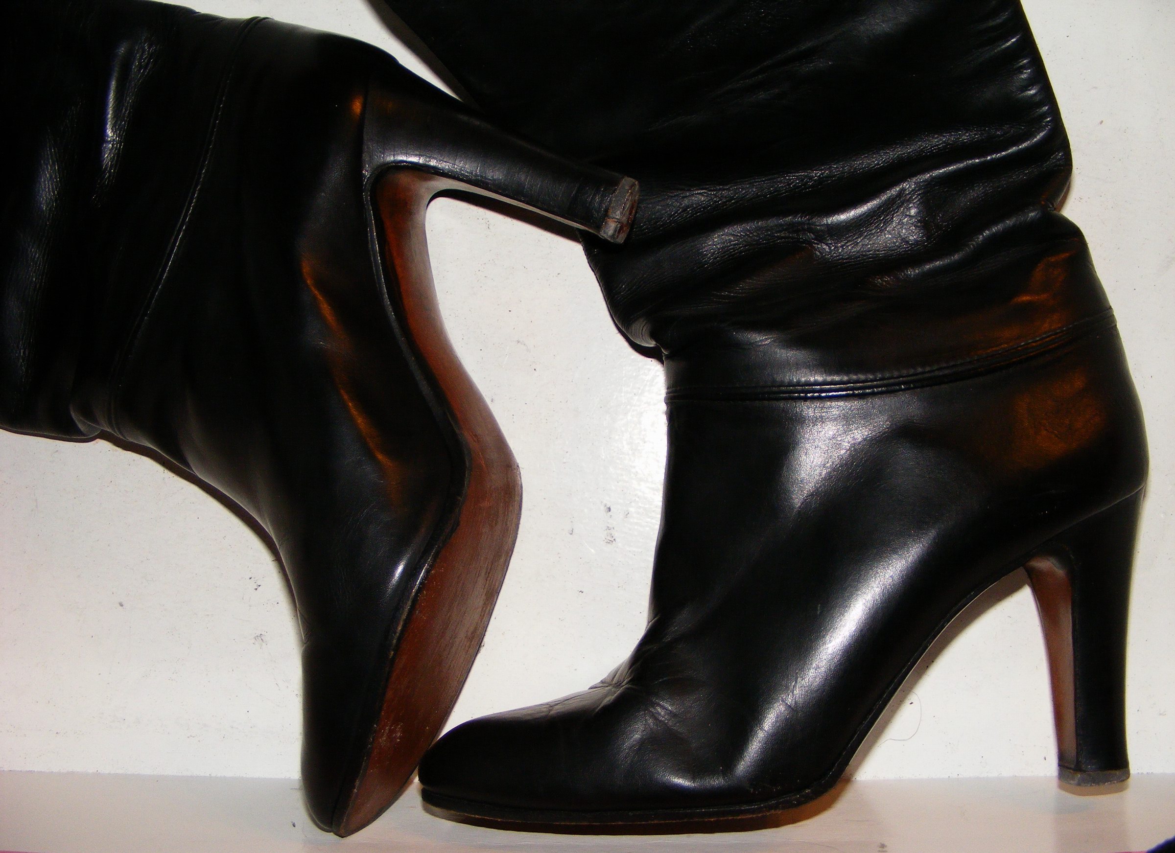 Diese herrlichen 70er Wunderwerke fand ich im Sperrmüll. Sie lagen verstaubt in einer typischen Küchen-Brennholz-Sitzkiste, eingeklemmt von Holzscheiten. Vermutlich waren die Stiefel mit ihrem kräftigen Leder zu groß für die kleine Herdfeueröffnung, sodaß sie in der Kiste längere Zeit Überleben konnten. Warum die Kiste einschließlich Brennholz und den Stiefeln in den Sperrmüll kam, war mir ein Rätsel. Sicherlich hatter man den Küchenherd außer Betrieb gesetzt? Wie dem auch sei, ich packte das Holz und die Stiefel in mein Auto. Erst zu Hause hatte ich die Zeit, die Teile genauer zu Betrachten. Die Stiefel sind aus Leder mit Echtlederfutter und Echtledersohlen, Größe 41 mit perfekt gerundeten Spitzen. Die Sohlen waren mit Gummi nachbesohlt, ich vermutete, daß sie Durchgelaufen waren. Der Gummi ließ sich leicht ablösen, es war kein Defekt zu erkennen. Absätze und Oberleder waren in tadellosem Zustand, hatten lediglich kräftige Nässe- und Schimmelflecken, die aber schon lange trocken waren und vermutlich noch vom letzten Tragen stammen mußten.