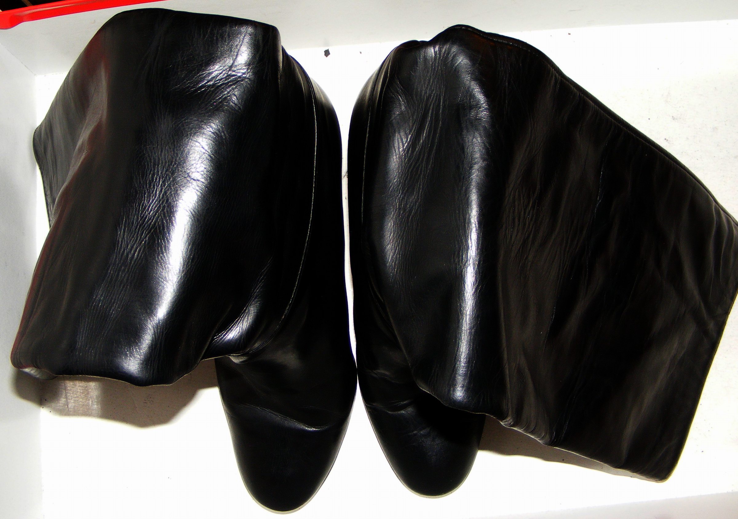 Diese herrlichen 70er Wunderwerke fand ich im Sperrmüll. Sie lagen verstaubt in einer typischen Küchen-Brennholz-Sitzkiste, eingeklemmt von Holzscheiten. Vermutlich waren die Stiefel mit ihrem kräftigen Leder zu groß für die kleine Herdfeueröffnung, sodaß sie in der Kiste längere Zeit Überleben konnten. Warum die Kiste einschließlich Brennholz und den Stiefeln in den Sperrmüll kam, war mir ein Rätsel. Sicherlich hatter man den Küchenherd außer Betrieb gesetzt? Wie dem auch sei, ich packte das Holz und die Stiefel in mein Auto. Erst zu Hause hatte ich die Zeit, die Teile genauer zu Betrachten. Die Stiefel sind aus Leder mit Echtlederfutter und Echtledersohlen, Größe 41 mit perfekt gerundeten Spitzen. Die Sohlen waren mit Gummi nachbesohlt, ich vermutete, daß sie Durchgelaufen waren. Der Gummi ließ sich leicht ablösen, es war kein Defekt zu erkennen. Absätze und Oberleder waren in tadellosem Zustand, hatten lediglich kräftige Nässe- und Schimmelflecken, die aber schon lange trocken waren und vermutlich noch vom letzten Tragen stammen mußten.