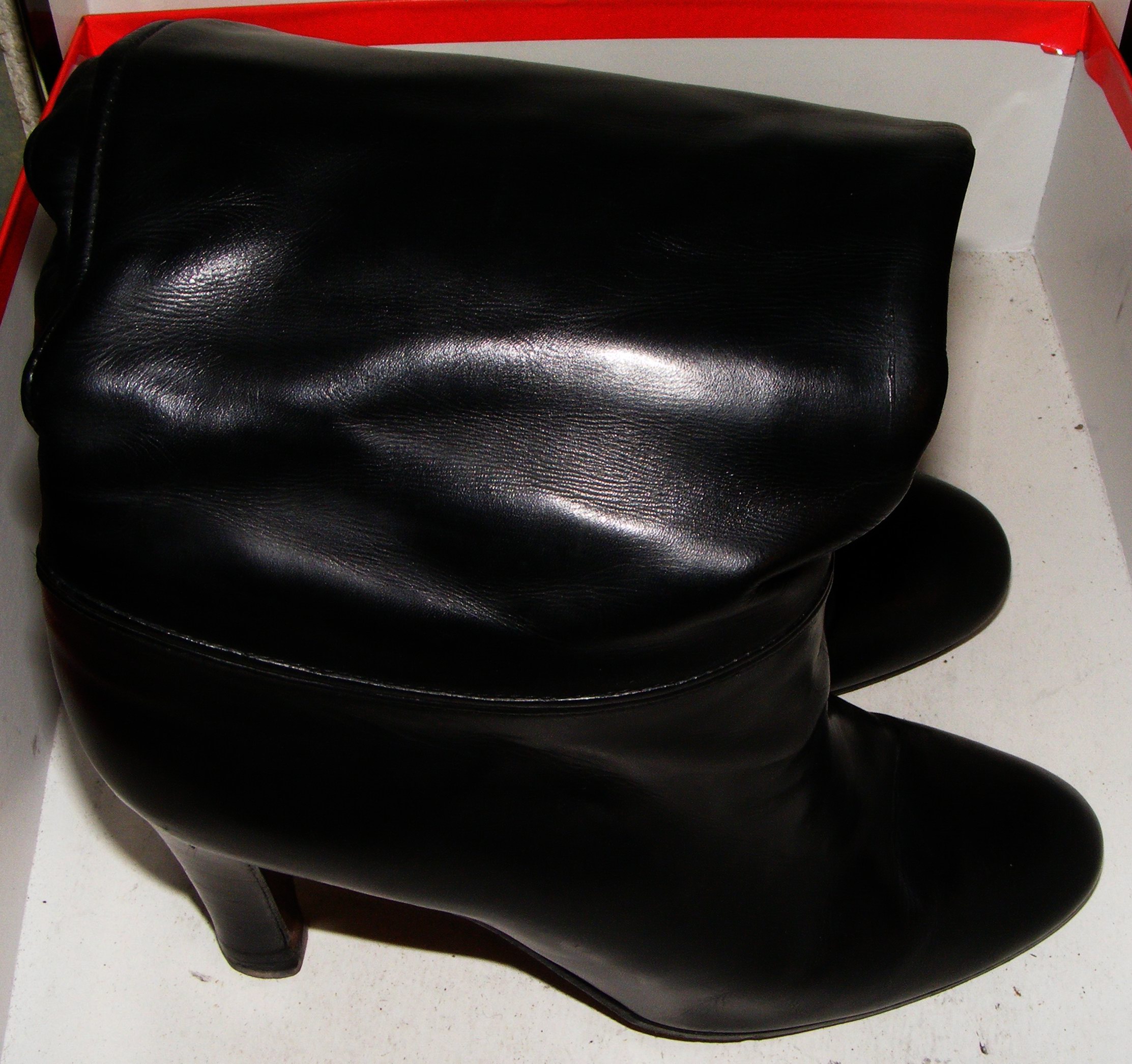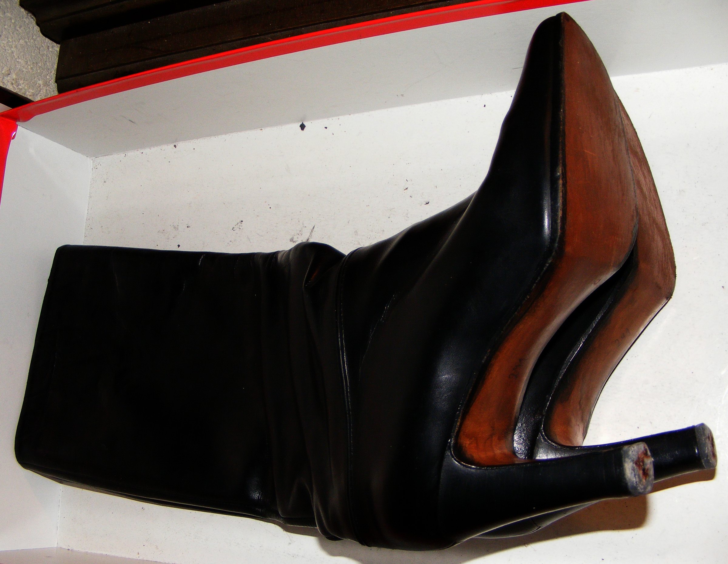 Diese herrlichen 70er Wunderwerke fand ich im Sperrmüll. Sie lagen verstaubt in einer typischen Küchen-Brennholz-Sitzkiste, eingeklemmt von Holzscheiten. Vermutlich waren die Stiefel mit ihrem kräftigen Leder zu groß für die kleine Herdfeueröffnung, sodaß sie in der Kiste längere Zeit Überleben konnten. Warum die Kiste einschließlich Brennholz und den Stiefeln in den Sperrmüll kam, war mir ein Rätsel. Sicherlich hatter man den Küchenherd außer Betrieb gesetzt? Wie dem auch sei, ich packte das Holz und die Stiefel in mein Auto. Erst zu Hause hatte ich die Zeit, die Teile genauer zu Betrachten. Die Stiefel sind aus Leder mit Echtlederfutter und Echtledersohlen, Größe 41 mit perfekt gerundeten Spitzen. Die Sohlen waren mit Gummi nachbesohlt, ich vermutete, daß sie Durchgelaufen waren. Der Gummi ließ sich leicht ablösen, es war kein Defekt zu erkennen. Absätze und Oberleder waren in tadellosem Zustand, hatten lediglich kräftige Nässe- und Schimmelflecken, die aber schon lange trocken waren und vermutlich noch vom letzten Tragen stammen mußten.