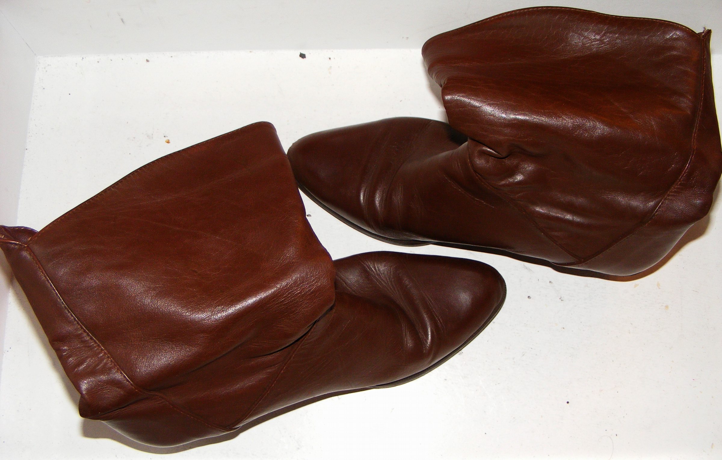 Einmal fanden wir ein Paar braune Lederstiefel mit knielangen, weichen weiten Schäften in Reiterart. Die hatten Oben einen Saum aus gezacktem grünen Leder. Aber, sie hatten Größe 37 - bereits damals schon zu Klein für mich.