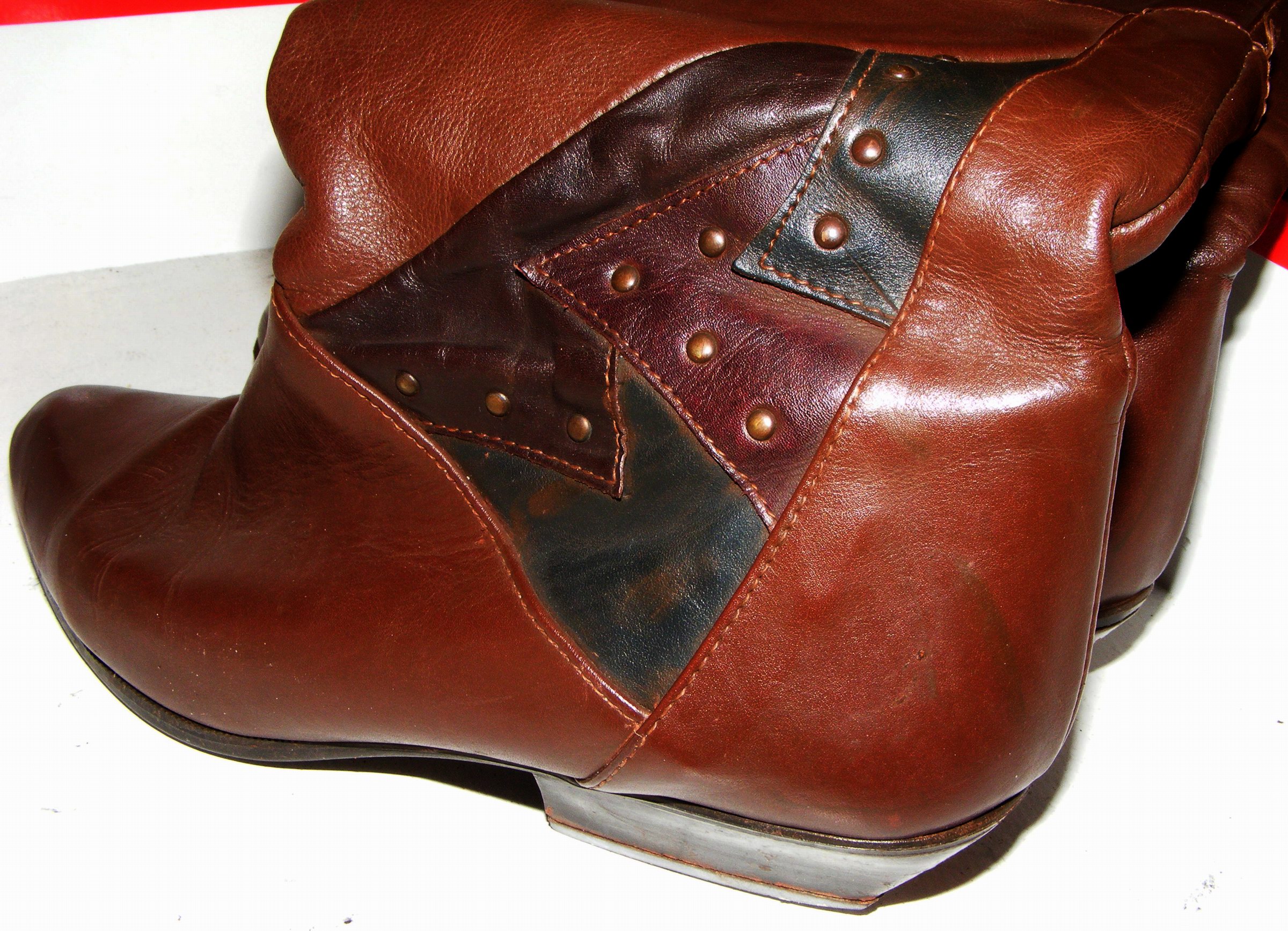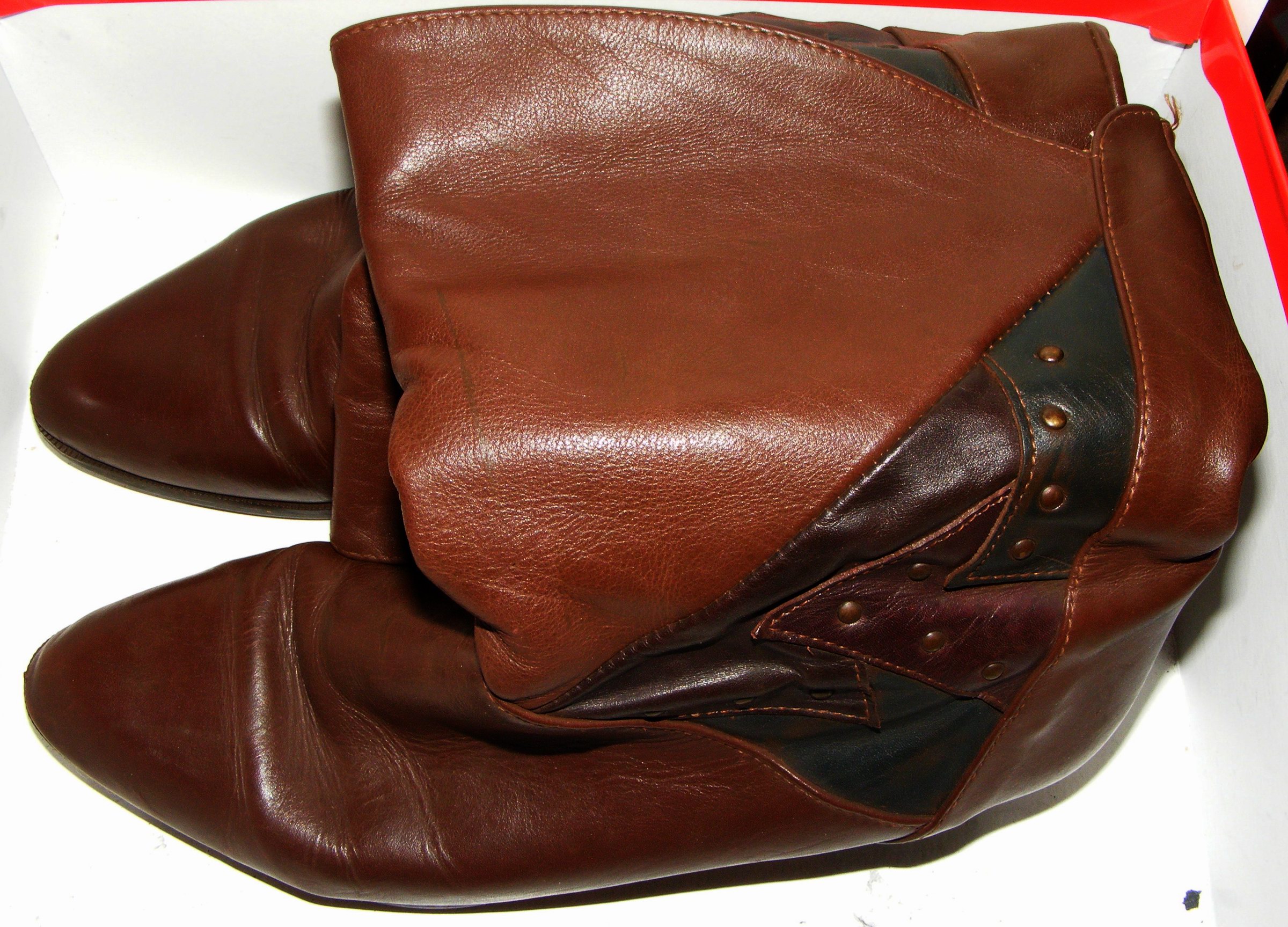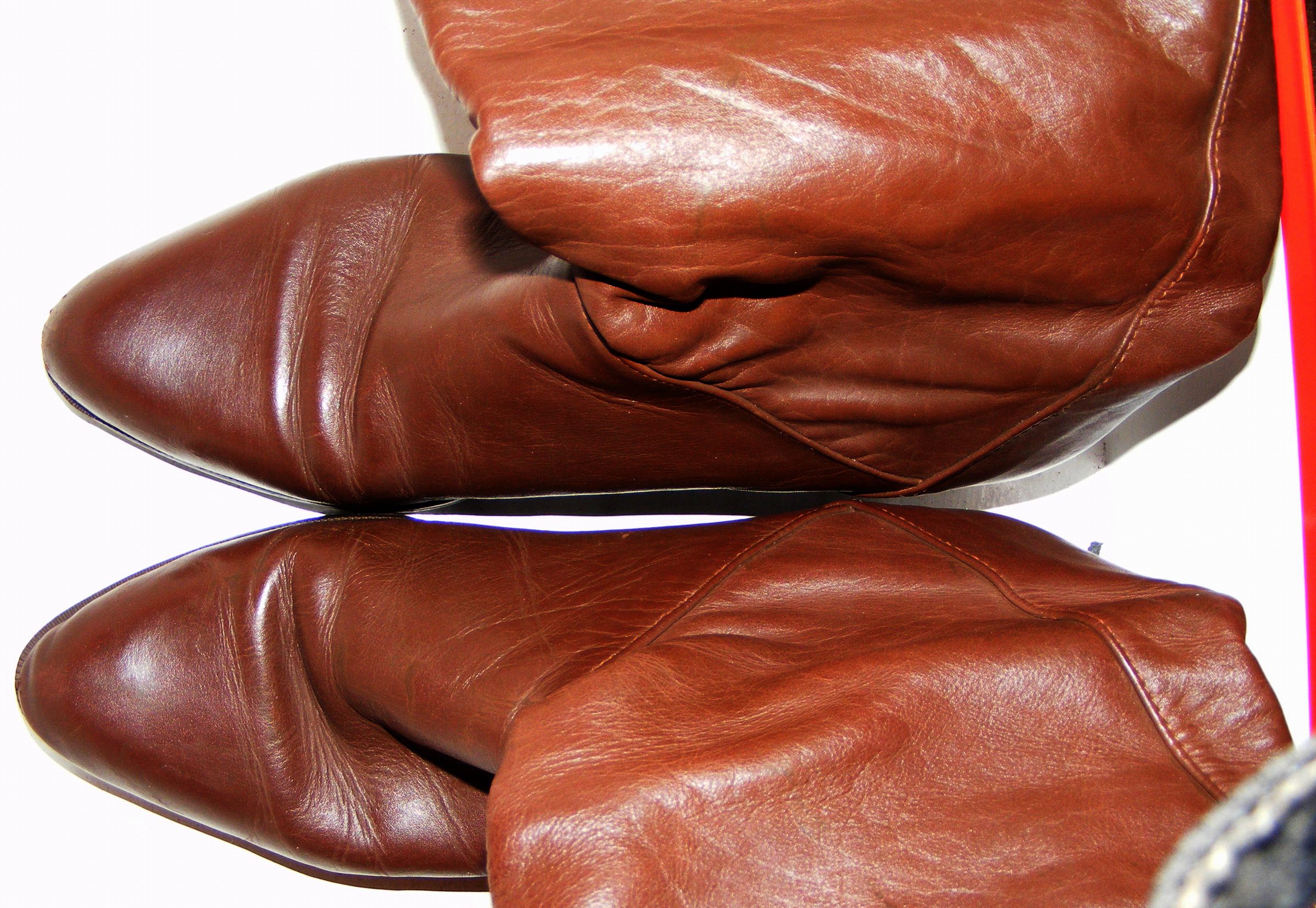 Einmal fanden wir ein Paar braune Lederstiefel mit knielangen, weichen weiten Schäften in Reiterart. Die hatten Oben einen Saum aus gezacktem grünen Leder. Aber, sie hatten Größe 37 - bereits damals schon zu Klein für mich.