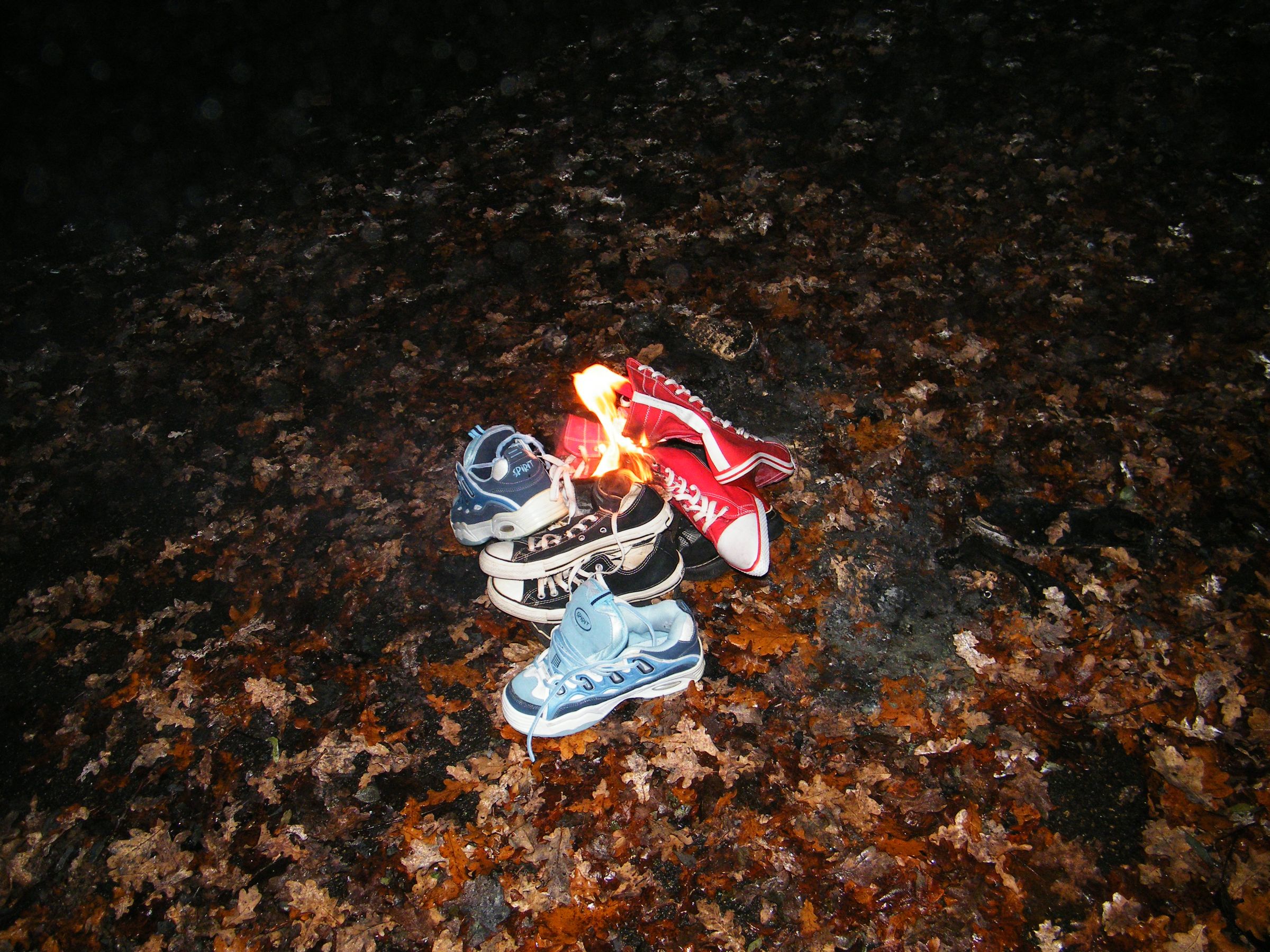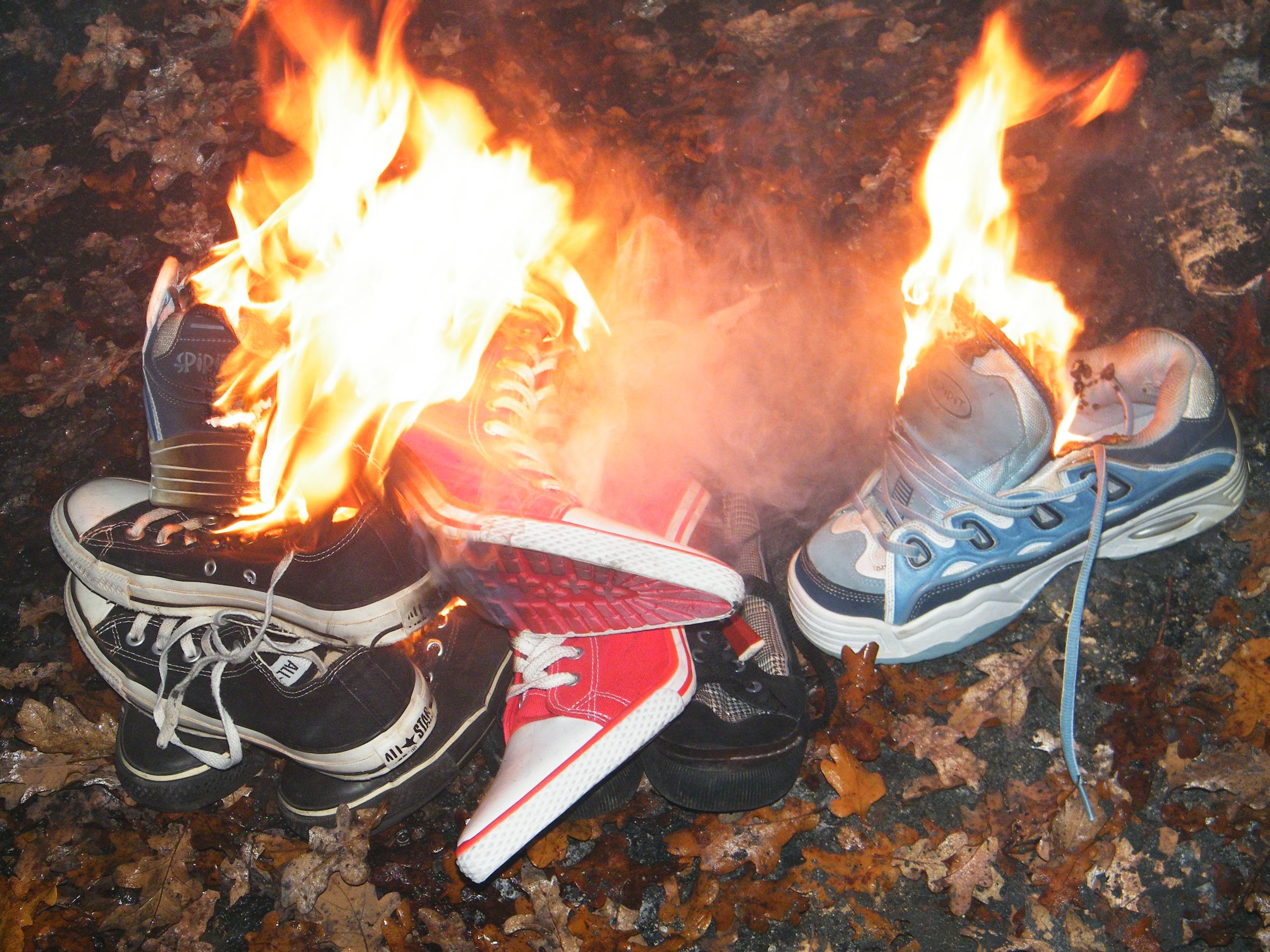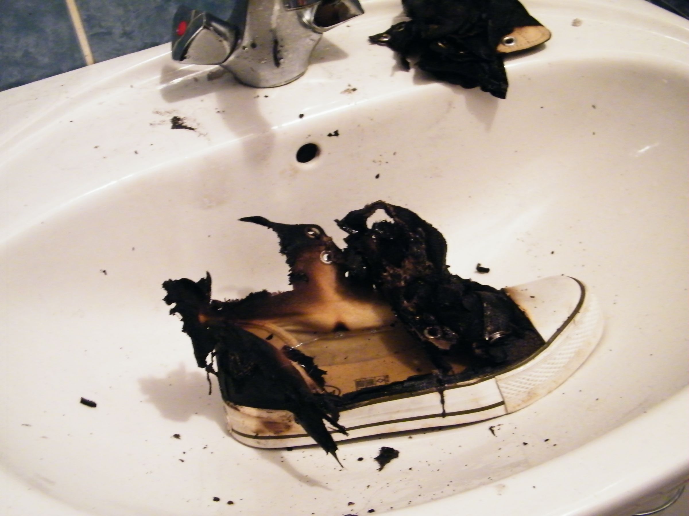 Daraus gelernt, fand' der nächste Videodreh - und alle, die noch folgen sollten - im heimischen Badezimmer aufgrund der vorhandenen (Rauch-)Abzugsanlage (fragt nicht, wofür die da ist!) statt. Ich frage mich, warum ich da nicht gleich drauf gekommen bin. Aber ich sollte lernen, dass Adidas' Superstars zum einen ungern brennen wollen und zum anderen, wenn sie denn mal aus eigener Kraft Feuer gefangen haben, fürchterliche Gerüche absondern. Inzwischen verwendet man zwar Brandbeschleuniger und andere Utensilien, weil man daraus gelernt hat, doch muss ich zugeben: Die Superstars waren nicht die schlimmsten Fußbekleidungsstücke in dieser Hinsicht!