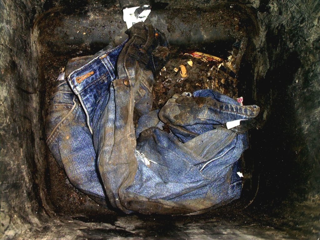 es scheint fast so, dass die Jeans mal in dem Küchenmüllbeutel gelegen hat und bei der Leerung des Containers der ganze Dreck noch am Boden geklebt hat und nicht in die Müllschüttung gerutscht ist. Also diese Jeans und nun echt "Restmüll".