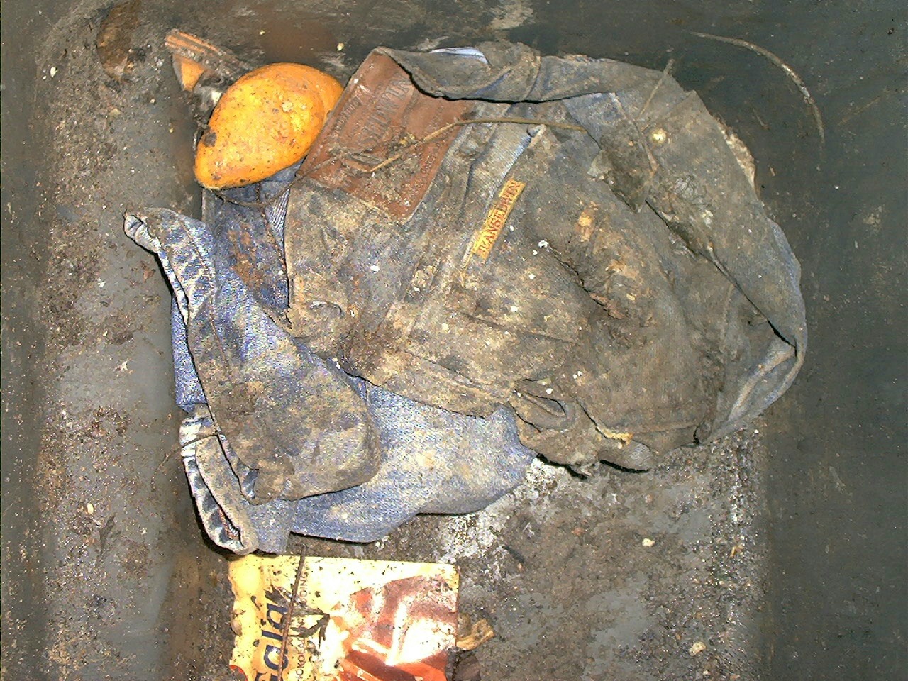 es scheint fast so, dass die Jeans mal in dem Küchenmüllbeutel gelegen hat und bei der Leerung des Containers der ganze Dreck noch am Boden geklebt hat und nicht in die Müllschüttung gerutscht ist. Also diese Jeans und nun echt "Restmüll".