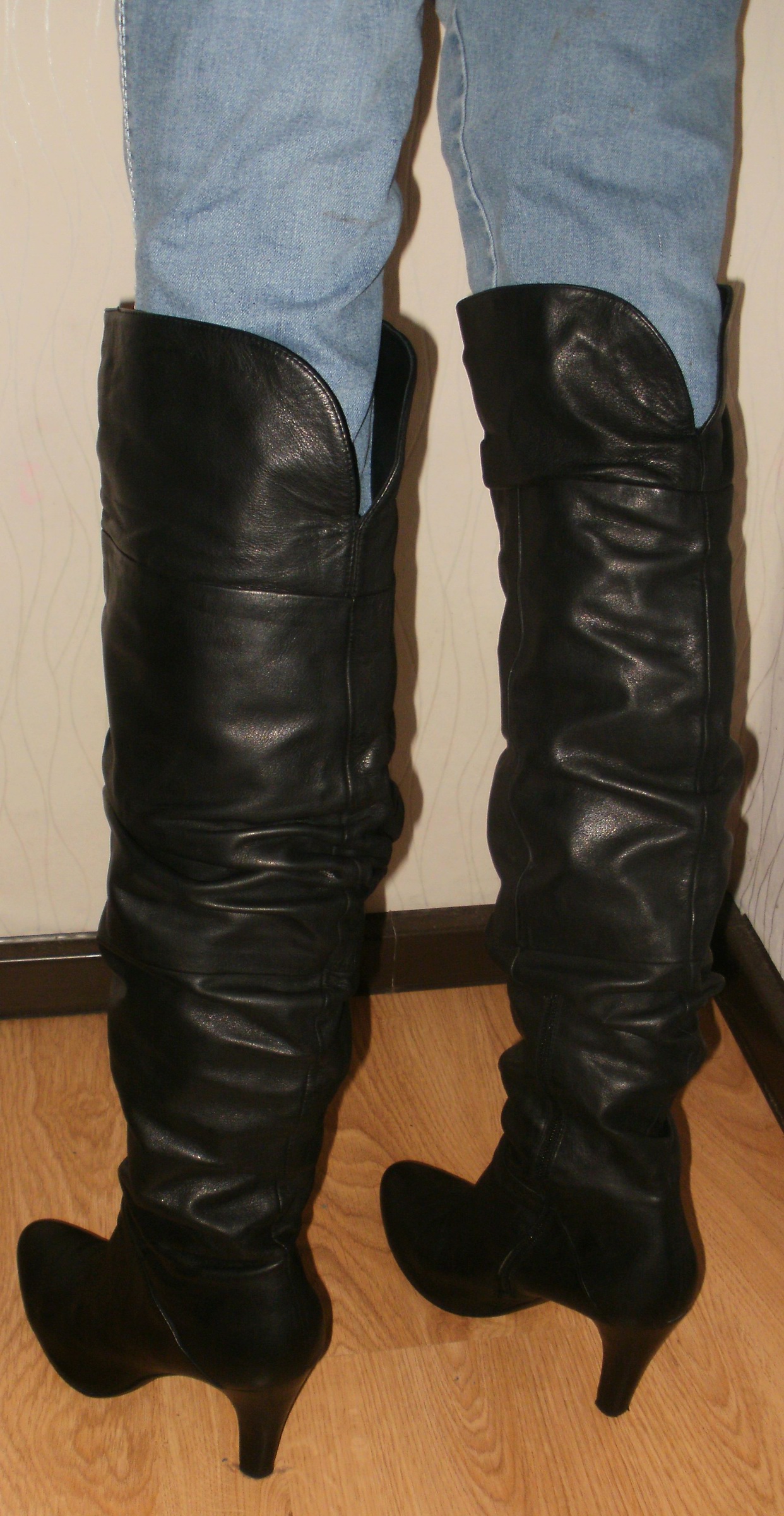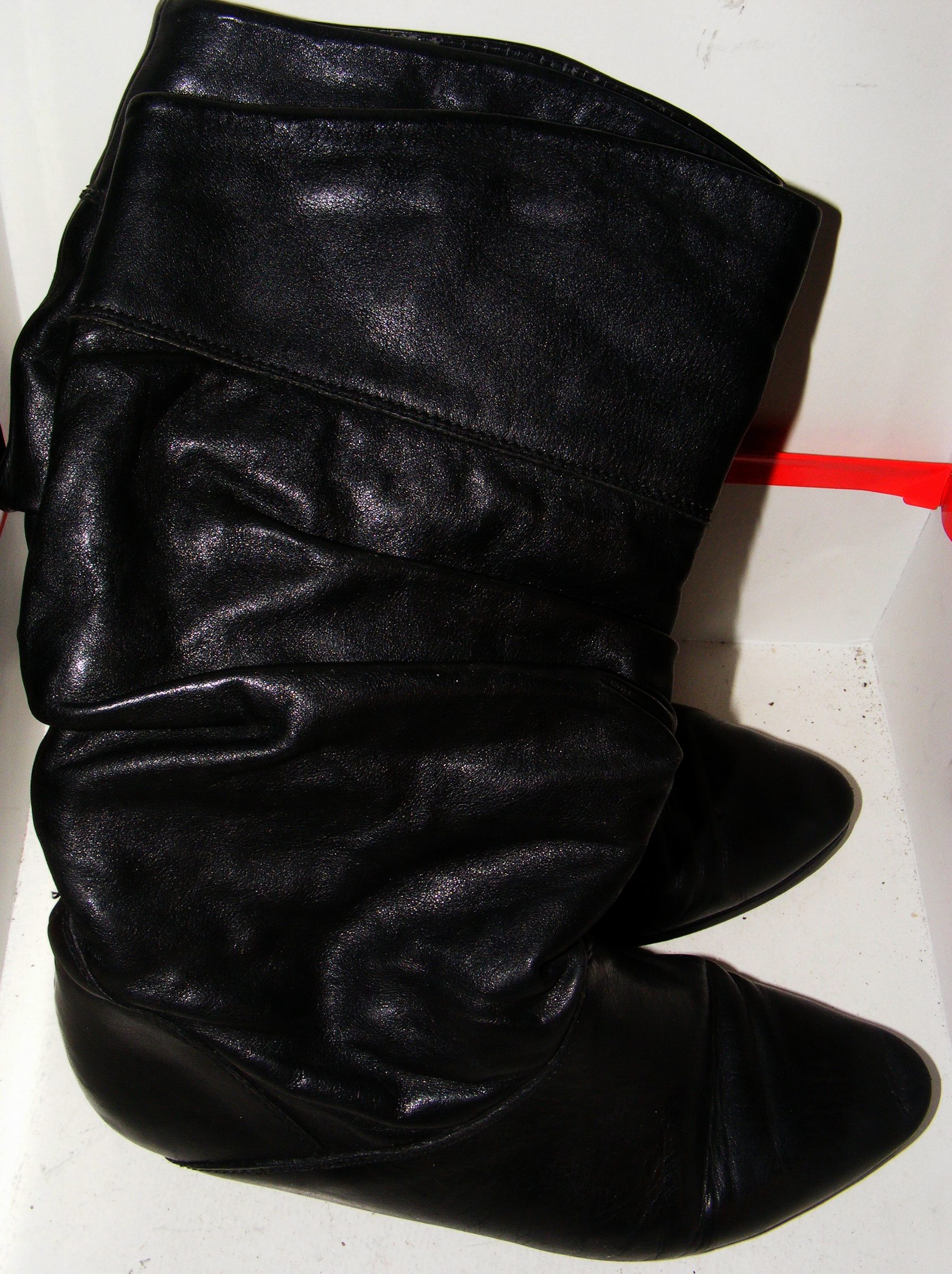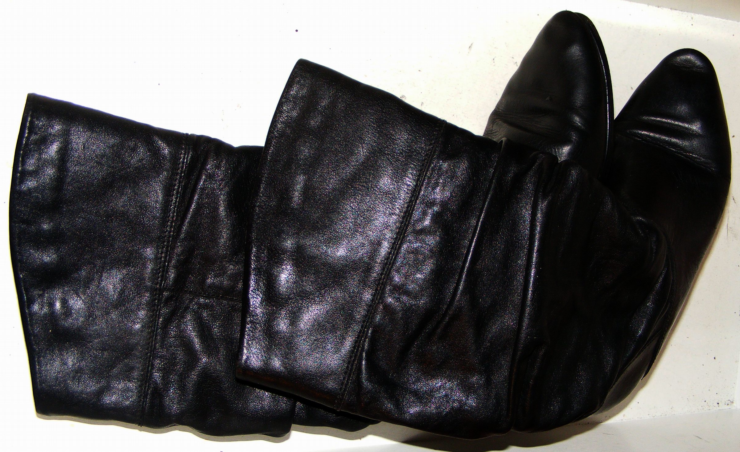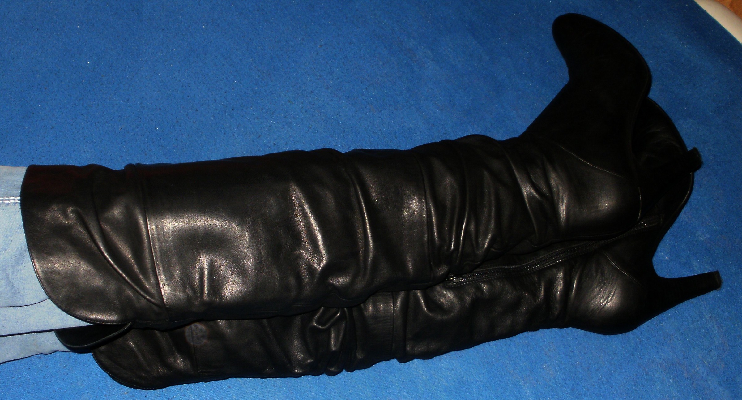 Die Stiefel, auf den Oben gezeigten Fotos, wo sie noch "vermüllt" und unaufgearbeitet gerollt im Badeofen liegen - die sind perkekt. Sehr weich und weit, kein Reißverschluß, lang bis wenigstens über die Kniescheibe (irgendwo hatte ich schon Tragefotos) und das 1 cm-Plateau optisch noch "verschmerzbar". :P