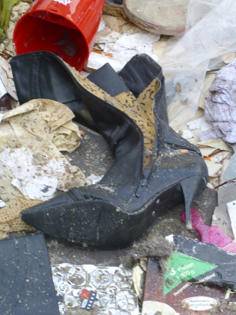 Ein echt seltener Vor"gang" auf einer Müllkippe: Die ausrangierten Stiefel einer Frau laufen auf eigenen Absätzen zu der Stelle auf dem Müllberg, wo sie auch "deponiert" werden sollen.