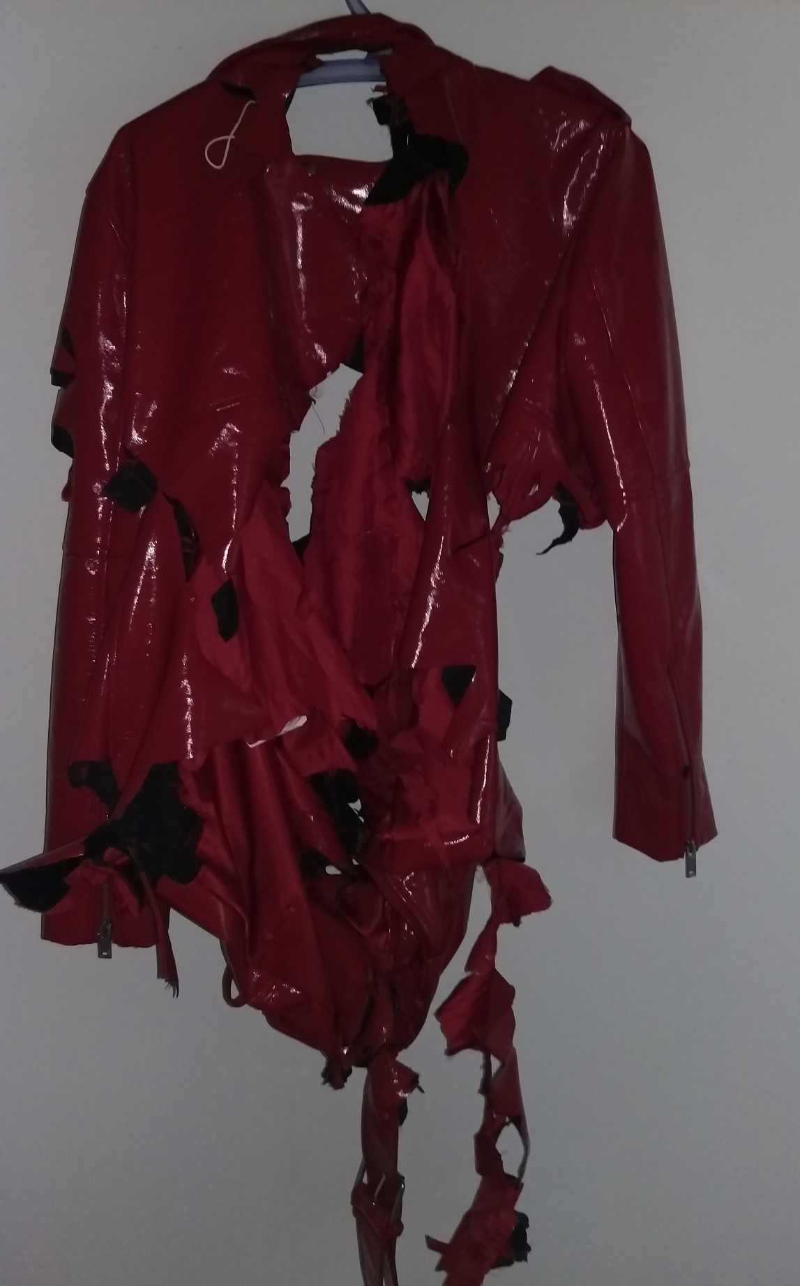 Ich bin mal reingeschlüpft. Ist eine 40. Zum Zumachen fehlen mindestens 20 cm aber man hätte sie richtig schön mittels spannen über dem Rücken zerreissen können. Habe noch ein paar diverse Jacken aus Lack und Kundtleder. Muss das mit dem Spannen einmal ausprobieren !