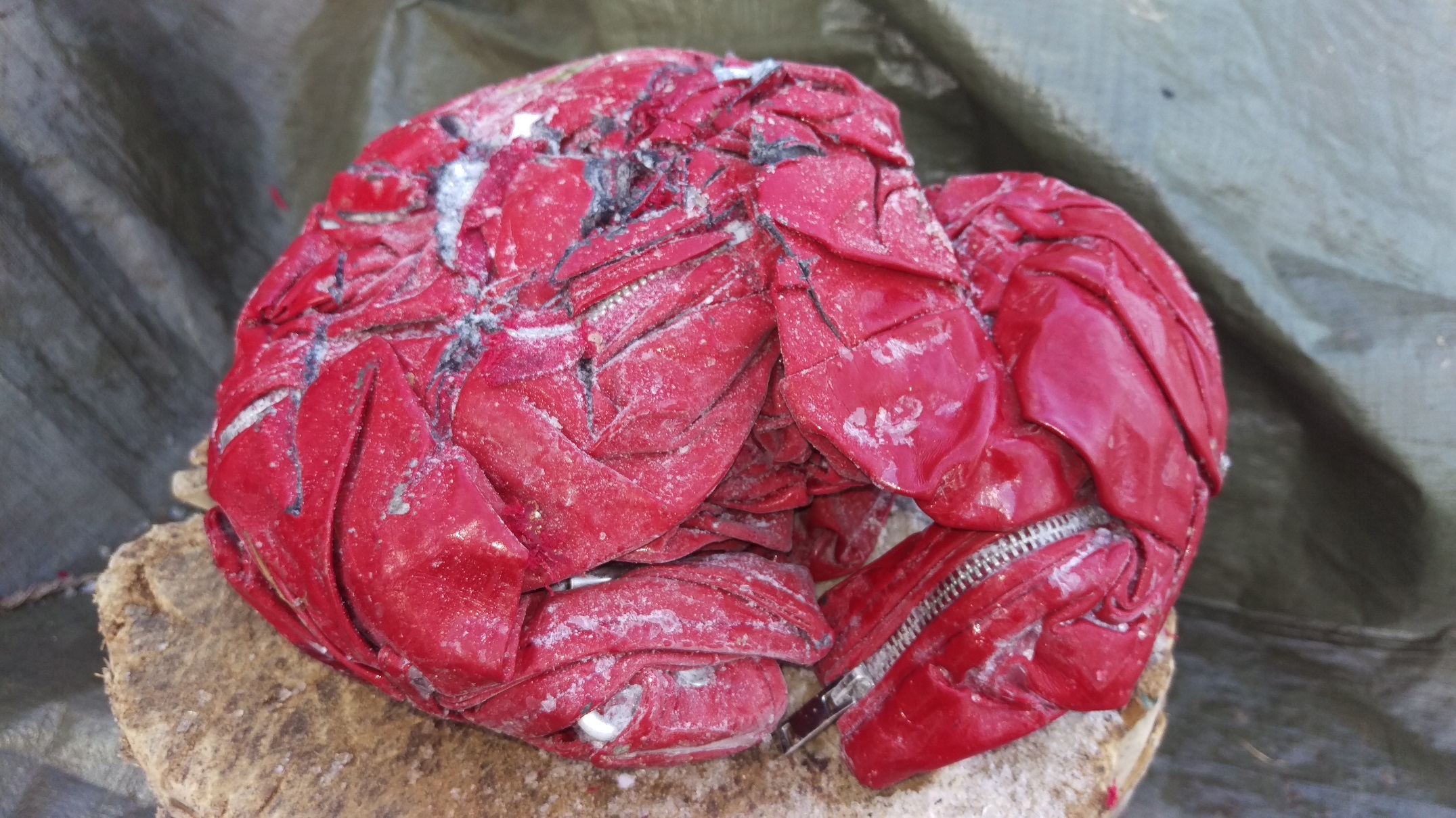 Hier noch ein close-up von dem Häufchen Elend: Das traurige Ende im gleichen Kübel wie es begonnen hat. Wie es wohl nach dem Auftauen aussehen wird ? Was meint Ihr, soll ich das Ganze einmal wiederholen mit einer schwarzen Kunstleder Bikerjacke ?