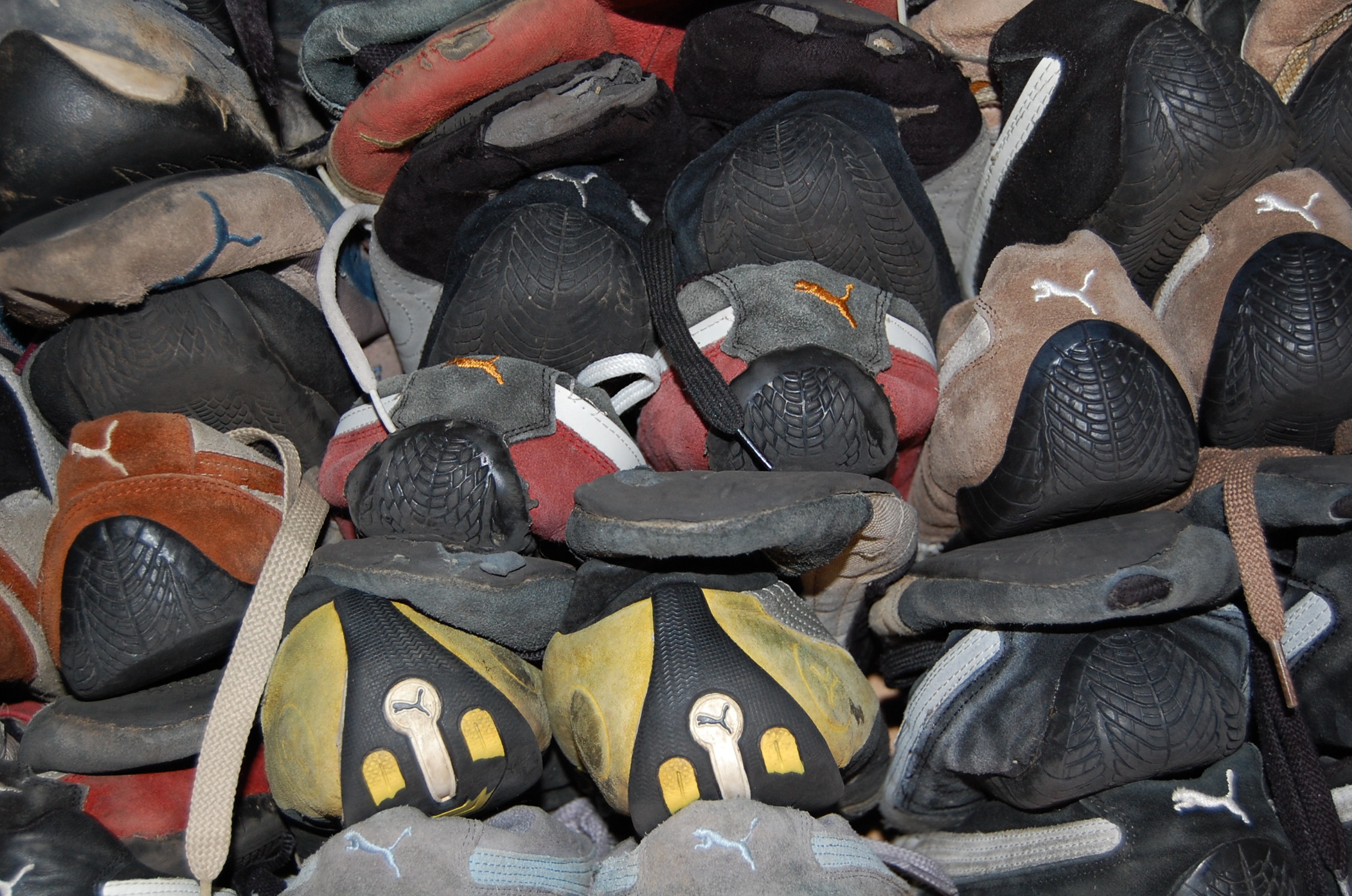 In diesem Frühjahr stieß Paul bei Aufräumarbeiten auf die vergessenen Pumas. Es mögen über 75 Paare gewesen sein. Die noch tragbaren Exemplare wurden heraussortiert und via Paket auf den afrikanischen Kontinent verschickt. Die aufgetragenen und kaputten Paare kamen weg.