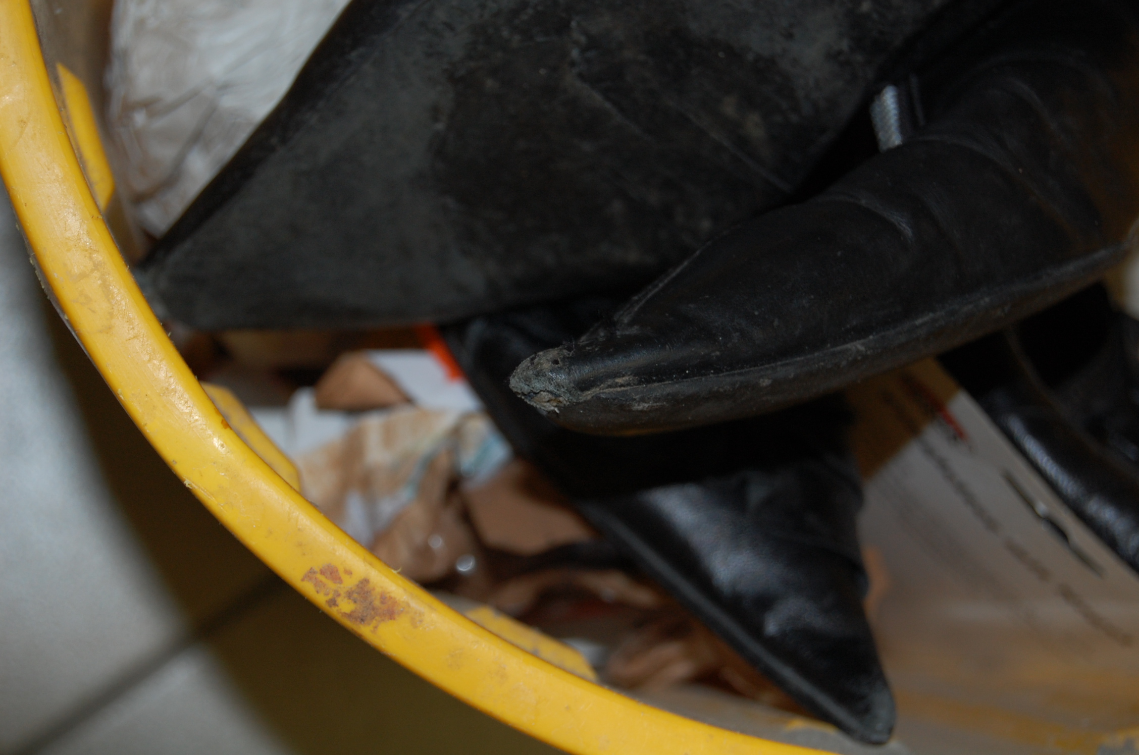 Nicht wenige haben sich schon gewundert, warum soviel Schuhe und sexy Klamotten in der Mülltonne unserer Hausgemeinschaft zu finden sind. Die Erklärung, die ich schon oft gegeben habe, ist sehr einfach: Auf dem Anwesen wohnen hauptsächlich junge Frauen und auch Alleinerziehende. Geld ist zwar da aber eben nicht im Übermaß. Also werden viel Schuhe und Klamotten getauscht, Second Hand gekauft und meist auch oft endfertig getragen. Dazu meine Bitte an die Mädels, den Befall von Insekten unserer Mülltonne möglichst zu vermeiden. Die Mädels haben schon festgestellt, dass meine Anordnung recht gut wirkt, ihre ausrangierten Schuhe und Klamotten mit dem übrigen siffigen Hausmüll zu vermischen, damit die Lumpen und meist gefütterten Schuhe die entstehende Müllbrühe aufsaugen. Da ich außerdem die Mülltonnen immer reinige, ist für empfindliche Frauennasen der Gang zu unserer Mülltonne noch relativ angenehm. Für ihre Bequemlichkeit tun „meine“ Mädels gerne etwas: Sie müssen nicht zum Altkleidercontainer gehen und sie kriegen nicht schon von weitem das Kotzen, wenn sie ihren Abfall zu unserer Mülltonne tragen.