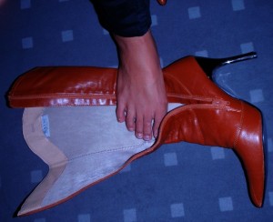 Also nahm ich all meinen Mut zusammen, zog ihr die Stiefel aus. Meine Hoffnung wurde erfüllt. Sie dufteten lediglich nach den Leder ihrer Stiefel und waren traumhaft schön gepflegt, kein Ansatz von Hornhaut, keine gelben Fußsohlen, rot lackierte Zehennägel. Sie sagte, während sie mich mit ihren nackten Götterfüßen am Kopf streichelte, bitte zieh mir die Pumps an!