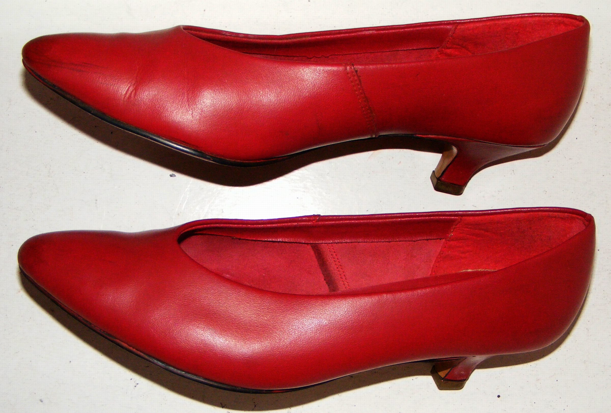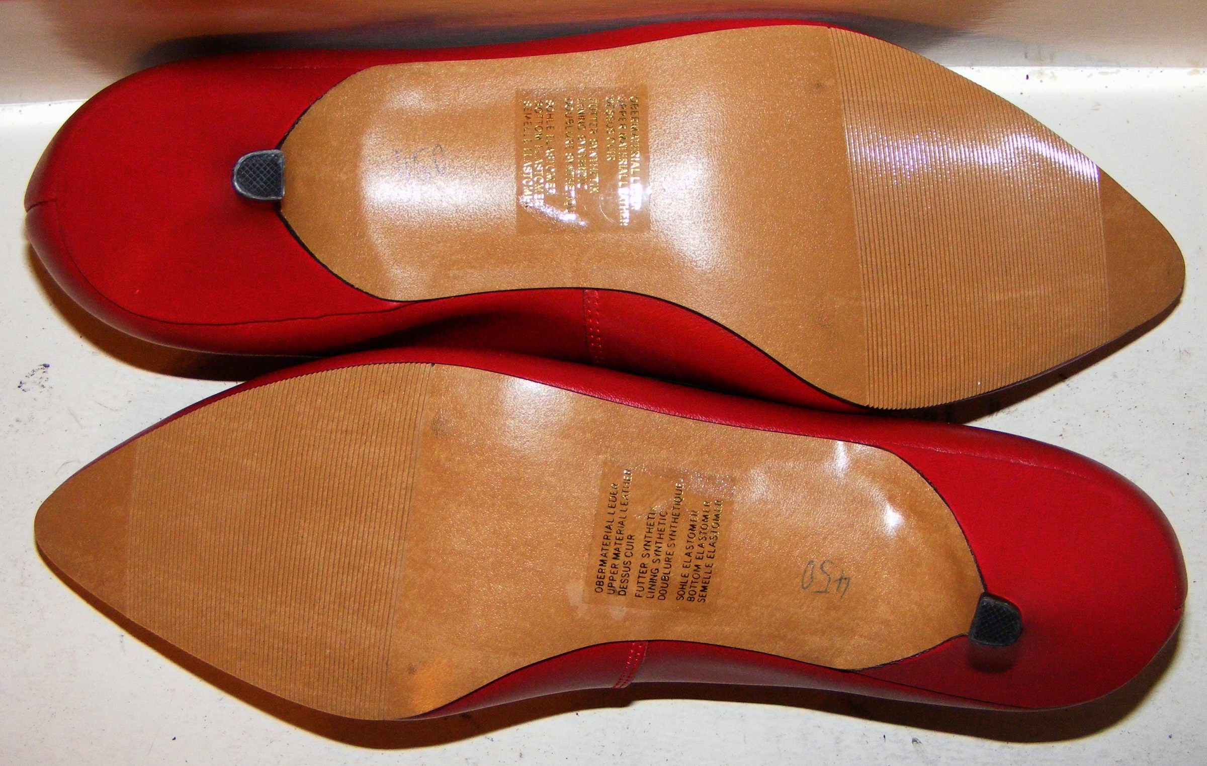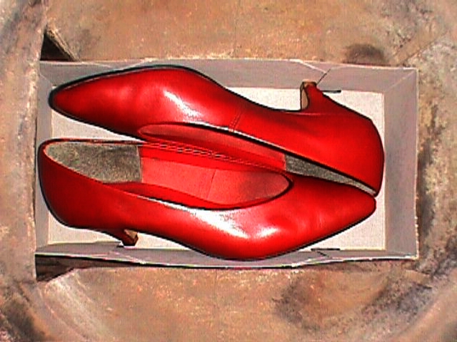 Anbei noch ein Paar, von einer damals mir gut bekannten 18jährigen Schuhverkäuferin einige Jahre bei der Arbeit (nur "indoor" auf Teppichboden) getragenen und im Sep. 1998 in die Altschuhkiste geworfenen (echt) Reno-Pumps. Sie selbst war in der Regel für die Beheizung des Laden-Ofens "zuständig", nur mein gelegentlicher Besuch und der warme Spätsommer rettete den Schuhen, die am Fuß der "Heizerin" mit Sicherheit schon viele ihre "Leidensgenossinnen" haben Brennen sehen, ganz knapp ihr Leben!