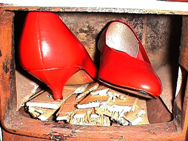 Oh, wie ungeschickt, beim Vorbereiten des Feuers warf die Kellnerin mit ihrem Knie den überfüllten Korb um - egal, liegen somit die Schuhe gleich griffbereit vor der Feuertür. Ihre Anzahl wird sich ohnehin gleich alle drei Minuten unter heftigstem Wummern und Fauchen der Flammenhölle je um Einen vermindern. Kaum aufgelegt, klappen die weichen Pumps nach Oben, bis die Spitze die Innensohle "küßt". Das ungefütterte dünne Leder brennt sofort durch, die verstärkten Hacken und die Absätze können diesem Feuersturm kaum folgen. Es bildet sich ein "Stapel" noch nicht vollständig verbranntem Hackenleders und der daran haftenden Federeisen. Bei jedem neu einzuführenden Schuh muß die Kellnerin erst Platz schaffen, indem sie die Reste mit seiner Spitze beiseite drückt, bis er ausreichend Platz zum Verbrennen findet. Mit dem Feuerhaken werden zwischzeitlich die ersten ausgeglühten Federeisen vom Rost gezogen, damit die Schuhe genug Brennluft durch die Rostpalten bekommen.