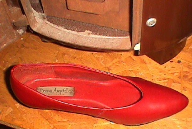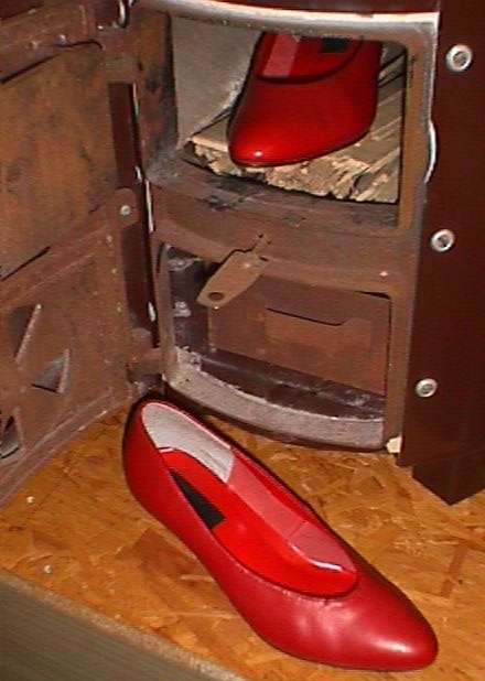 Die beim "Ausmisten" getragenen alten braunen Lederstiefel könnten eigentlich auch "mit weg", werden gegen die noch zur "Arbeit" am Ofen tauglichen blauen Pumps getauscht.