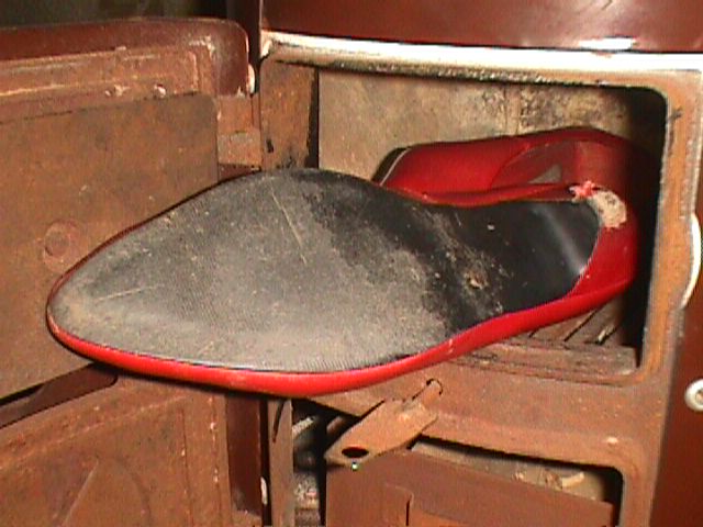 War das oftmals futterlose weiche Leder zusätzlich mit Schuhkreme durchtränkt, brauchten die Schuhe auf Holz- oder Kohlenglut nur wenige Sekunden, bis sie wie ein Taschenmesser Zusammenklappten und laut fauchend ihr Federeisen und das kurze Absatzsteckröhrchen Freigaben!