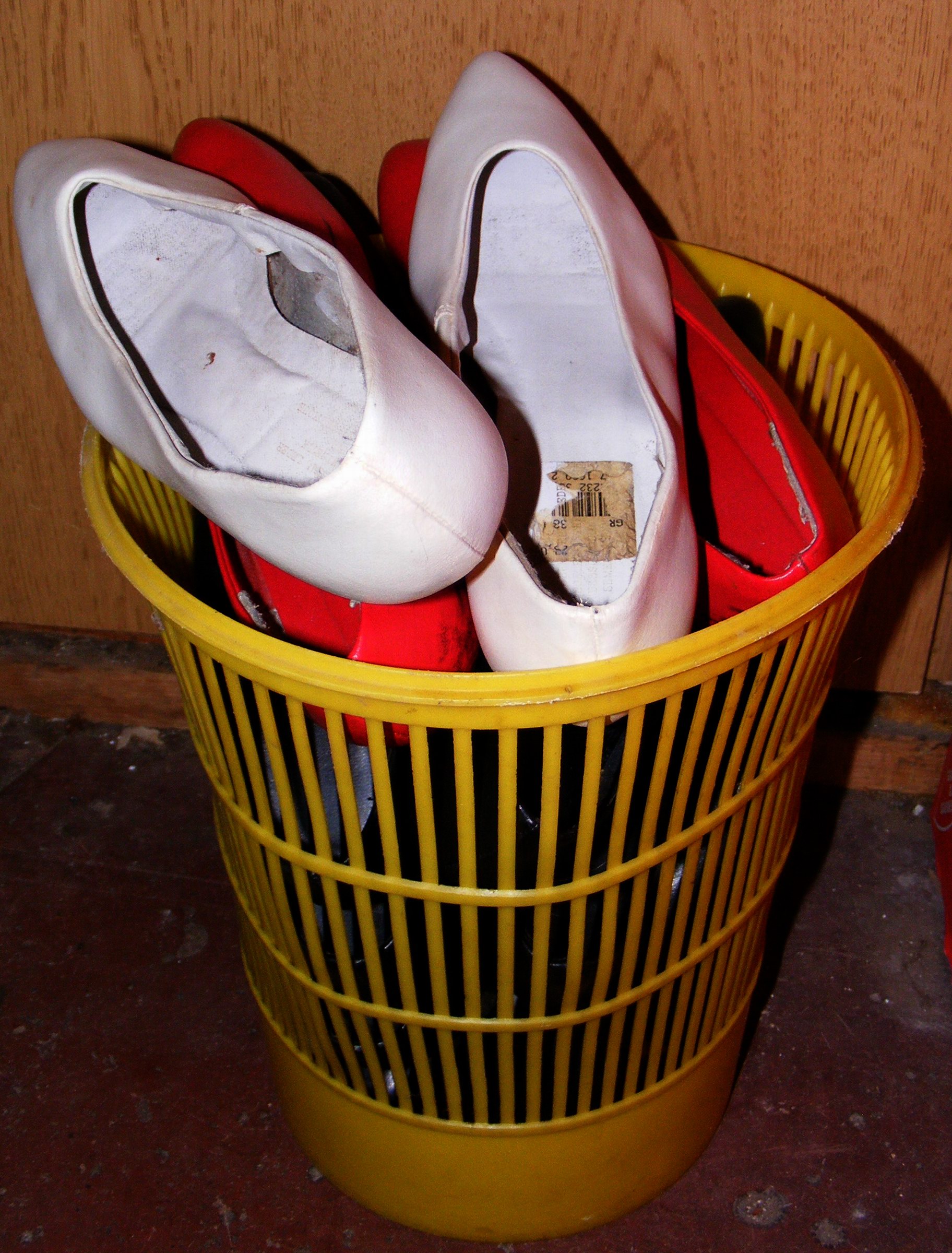 Zuerst wird der Korb nahe dem Schuhregal in "Wurfweite" in Stellung gebracht. Nach und nach werden alle "Arbeitspumps" geprüft - egal ob defekt oder einfach nur "zuviel" - was weg soll wirft die Kellnerin in den Papierkorb.