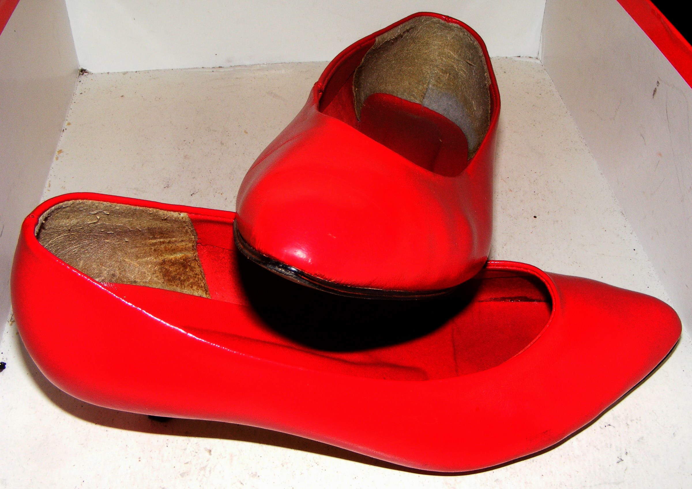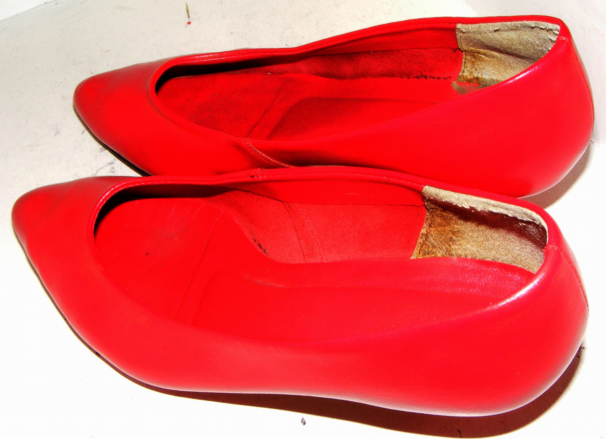 Anbei noch ein Paar, von einer damals mir gut bekannten 18jährigen Schuhverkäuferin einige Jahre bei der Arbeit (nur "indoor" auf Teppichboden) getragenen und im Sep. 1998 in die Altschuhkiste geworfenen (echt) Reno-Pumps. Sie selbst war in der Regel für die Beheizung des Laden-Ofens "zuständig", nur mein gelegentlicher Besuch und der warme Spätsommer rettete den Schuhen, die am Fuß der "Heizerin" mit Sicherheit schon viele ihre "Leidensgenossinnen" haben Brennen sehen, ganz knapp ihr Leben!