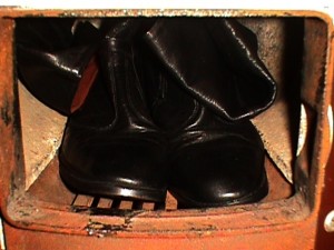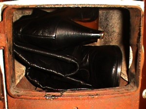 Nun Heute ist das Ganze etwas anders. Die zum Verfeuern bestimmten Schuhe sind in gestapelten Kisten verpackt, stehen im Heizkeller und werden bedarfsweise dann vor den Heizofen geschüttet.