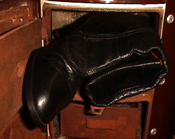 In vorherigen Beiträgen hatte ich schon oft beschrieben und/oder gezeigt, daß sich neben dem Badeofen ein Kohleneimer (bei mir zumeist für´s Holz) und ein Papierkorb befanden. Meine temporären Arbeits- und Badezimmerschuhe standen ebenfalls immer vor oder neben dem Ofen, zum Trocknen, wenn ich sie nach dem Baden oder Duschen zur "Folgekosmetik" Getragen hatte. Letztere nutzte ich auch dazu, mir mit ihnen beim Betrachten des erregenden Treibens im Ofen "Entspannung" zu Verschaffen, bevor sie dann je nach Zustand noch eine Weile Weitergenutzt oder ebenfalls mit Verfeuert wurden.