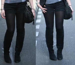 Da ging´s im Sommer fast täglich mit ´nem schwarzen Minirock oder einer Extrem-Shorts in die Klasse, du wirst dich Erinnern, obligatorisch dazu flache schwarze Velourleder-Overknees, am besten "endfertig" Abgelatscht, und wegen meines strahlend blonden Teddys, zwingend noch ´ne 40er schwarze Strumpfhose. (Schwitz)