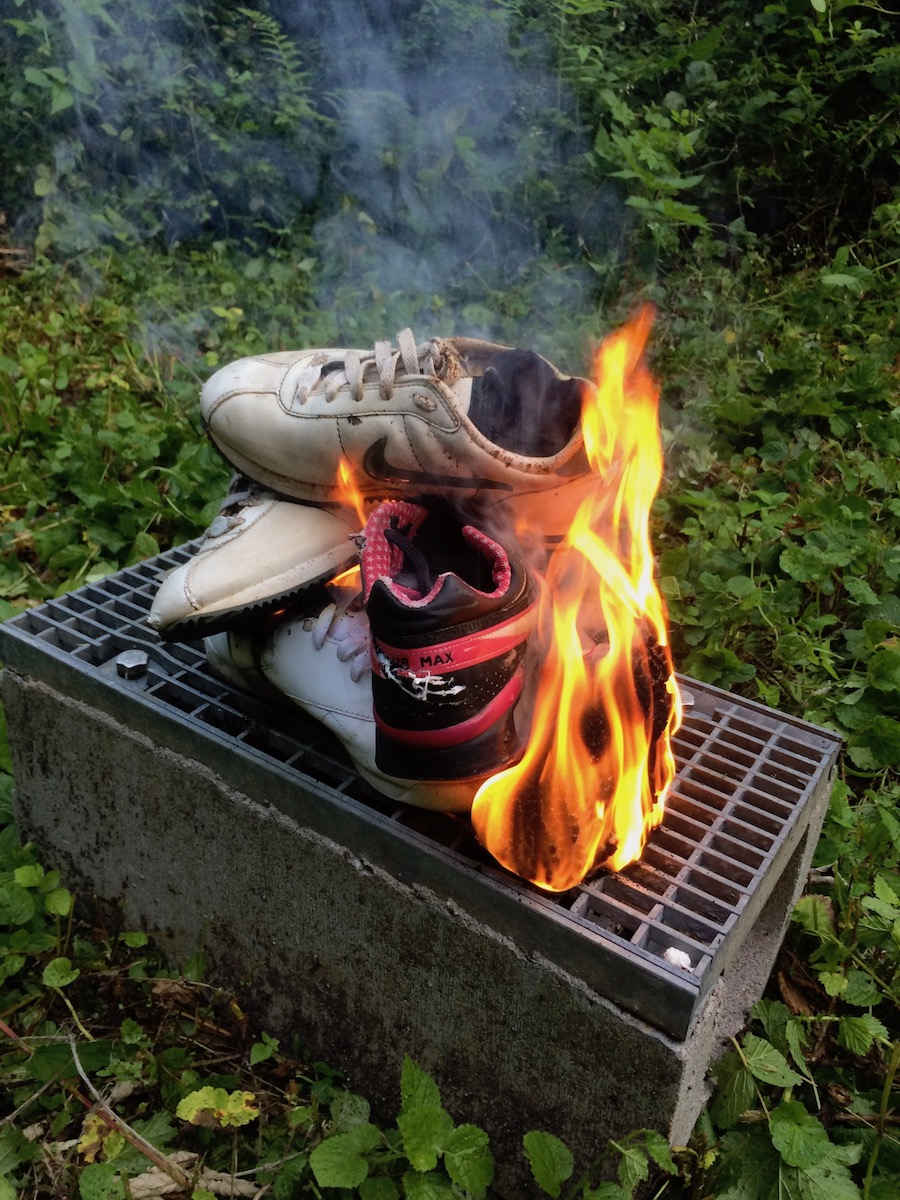 Alte Hausschuhe, Gymnastikschuhe, Turnschuhe wurden gerne von mir im Walde verbrannt. Anscheinend hatten mich die Flammen und die "Umwandlung" fasziniert und erregt.