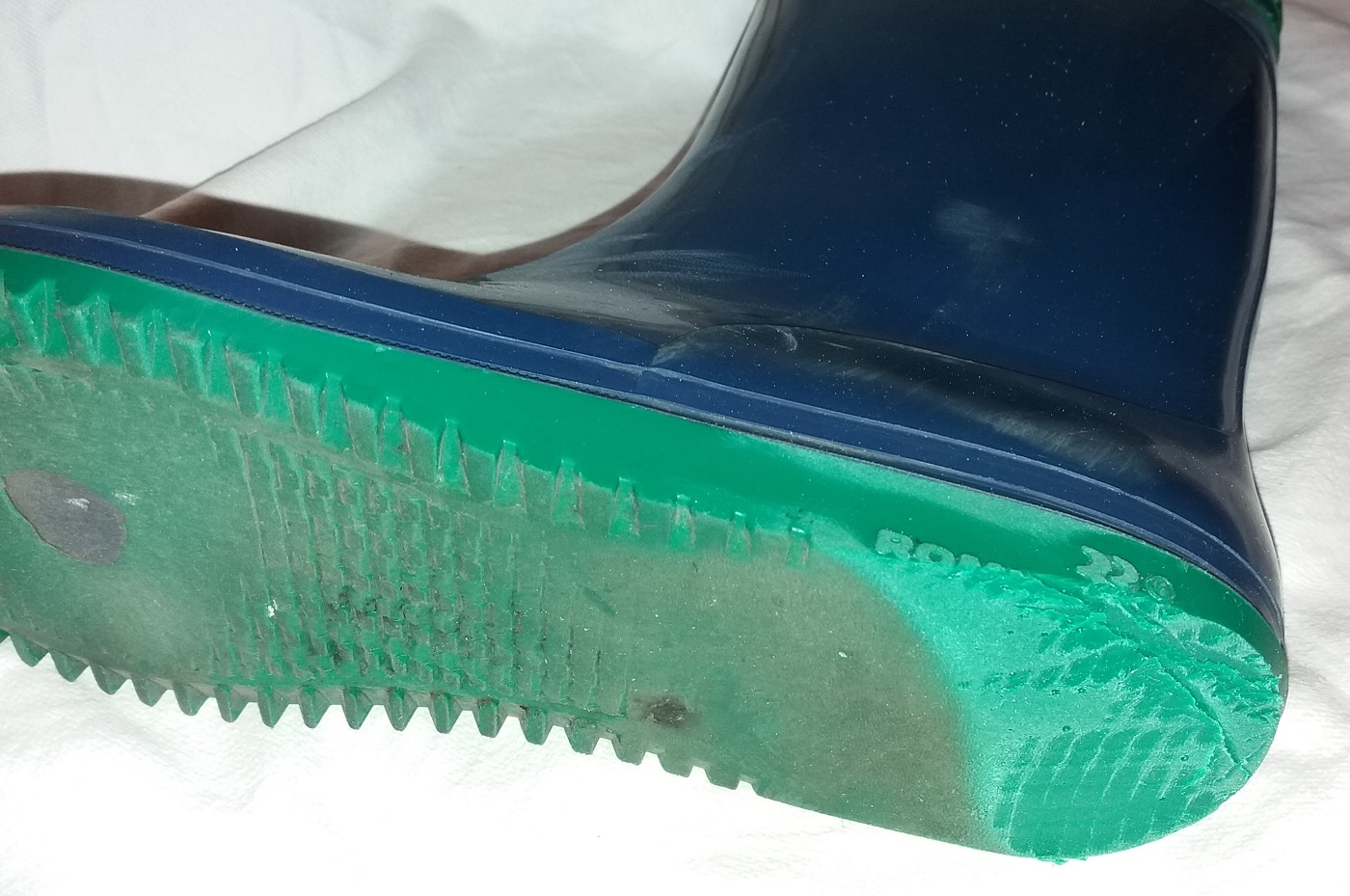 , indem ich etwa auf halber Länge des Stiefels das Messer ansetzte und die Sohle nach hinten wegschnitt. Jetzt fällt die Sohle flacher zum Hacken hin ab und das Laufen fällt wieder einfacher. Das minzgrüne PVC weißt jetzt am hinteren Ende noch eine Stärke von etwa 3 bis 4 Millimeter auf. Jetzt soll der grüne Teil der Sohle erst einmal abgelatscht werden, bevor ich den Bobbies weitere Schnitte verpasse. Ich hoffe, das Loch am unteren Rand des Schafts reißt bis dahin nicht weiter auf.