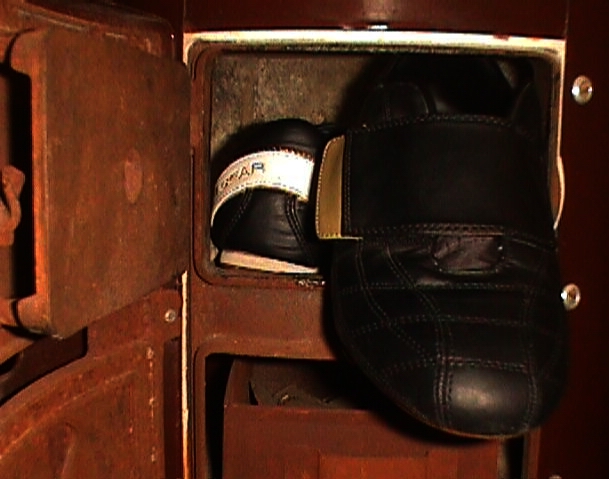 Sie wirft ihre Haare nach Hinten, klopft mit ihren Hacken aneinander und streckt dem Beobachter einladend die kernigen Reitstiefelabsätze entgegen; dessen Hose fällt auf den Fußboden. Als sie das nächste Paar Lederschuhe ins Feuer auflegt, spürt sie von Hinten einen energischen Griff an beide Brüste, er legt sich auf den Boden und knallt Einen zwischen die Stiefelsohlen, bis der wohlige Saft über beide geknickten Spitzen und den "Zara"-Schriftzug sickert.