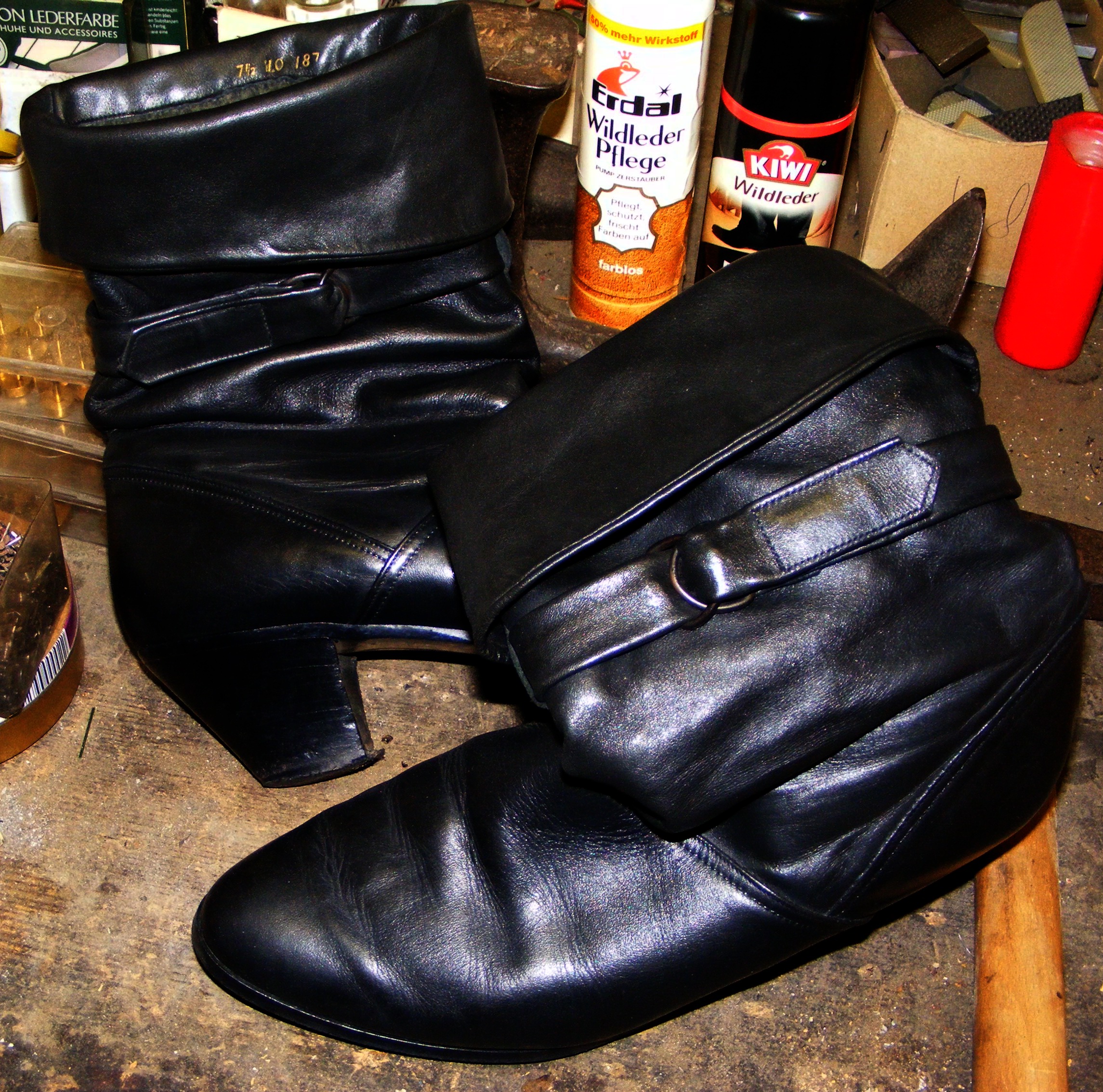 Am Deutlichsten ist´s aber eben bei meinen Stiefeln zu Sehen - die müssen möglichst extremst "gebraucht" sein, faltig und weich wie Putzlappen. Das Allein wäre ja nichts Besonderes: Frauen mit "verwahrlosten, ausgelatschten" Stiefeln sieht man oft genug - doch MEINE müssen auffällig gepflegt und sauber sein, in der "Substanz" ohne Defekte, Kratzer, Flecken und schließlich mit intakten, ordentlichen Absätzen/-belägen und dem vollständigen "Zubehör", wie Schnallen, Nieten u.ä.
