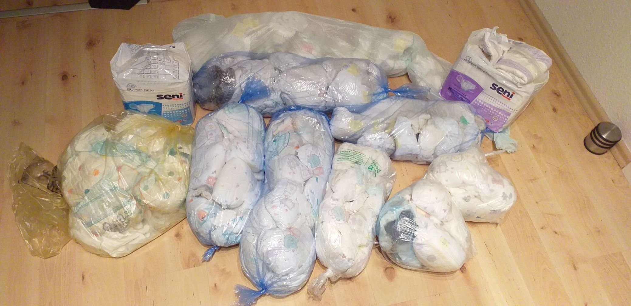Fundstücke der Tour von letzter Nacht: jede Menge Pampers Premium Protection in Gr. 6, ein paar Pampers Baby Dry Gr. 7, und als Krönung 2 Pakete Seni Gr. S mit jeweils noch 8 unbenutzen Windeln