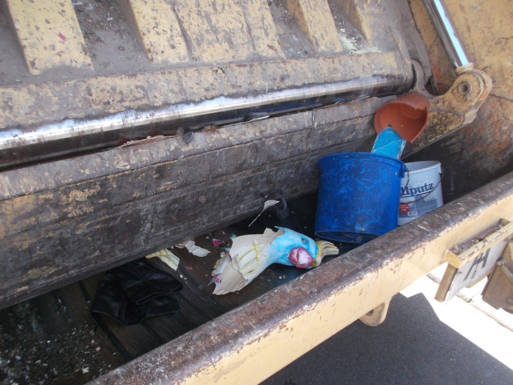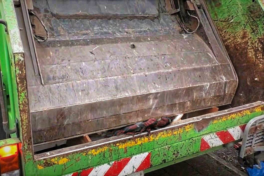 der Rest verschwindet unter lautem Krachen im Bauch des Müllautos. Ein abgerissener Streifen der Decke hängt noch aus der Pressung heraus