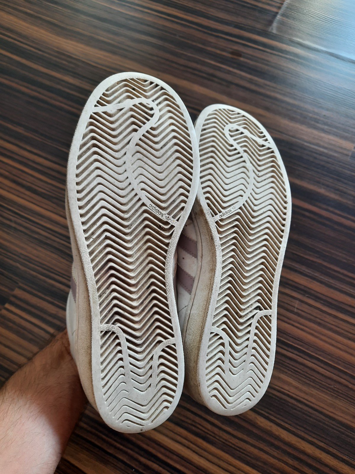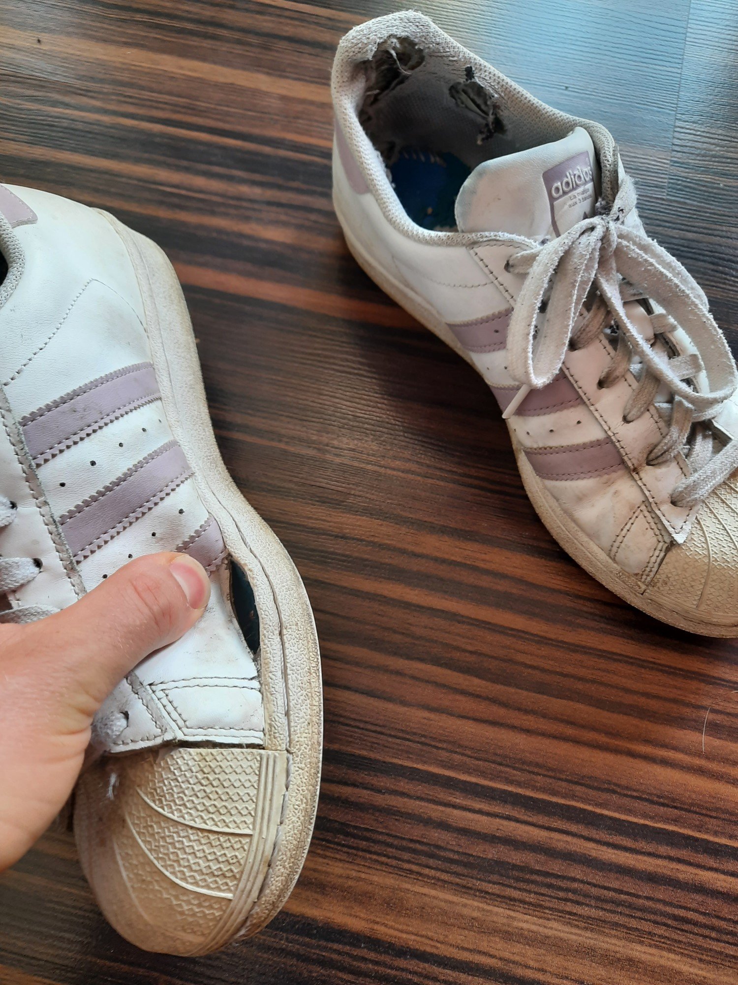 Die Nachbarin hat heute morgen ihre alten Superstars entsorgt. Die lagen in einem Müllbeutel und irgendwie fand ich die doch zu schade, um sie dort zu lassen, obwohl sie hoffnungslos durchgelatscht und völlig am Ende sind, mal sehen was ich damit noch mache. Die Trägerin ist eher kräftiger Statur, daher auch die grösse, 40 2/3. und ja ich weiss, dass die Schuhgrösse nichts mit der Statur zu tun hat :D