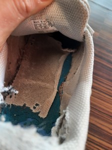 Die Nachbarin hat heute morgen ihre alten Superstars entsorgt. Die lagen in einem Müllbeutel und irgendwie fand ich die doch zu schade, um sie dort zu lassen, obwohl sie hoffnungslos durchgelatscht und völlig am Ende sind, mal sehen was ich damit noch mache. Die Trägerin ist eher kräftiger Statur, daher auch die grösse, 40 2/3. und ja ich weiss, dass die Schuhgrösse nichts mit der Statur zu tun hat